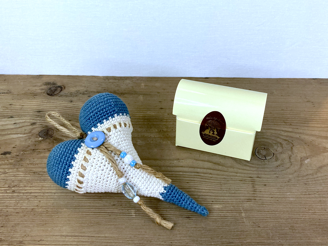 ca. 20g Dunkelblau (Farbe 1) und ca. 20g Cremeweiß (Farbe 2), etwas Füllwatte, Paket- oder Schleifenband, 1 Knopf und einige Perlen