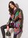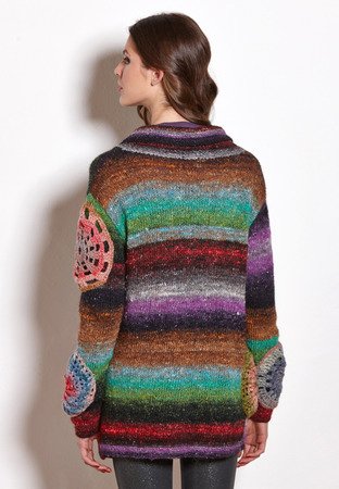 Noro "Silk Garden Lite" (45% Seide, 45% Mohair, 10% Schurwolle, LL ca 125 m/50 g): ca 450 (500-550-600) g Rot-Lila-Grün-Schwarz Fb 2051 und 150 g Rosa-Grün-Blau Fb 2131; addi-Stricknd 4 und 4,5 mm; addi-Rundstricknd 4 mm, 40 cm lang; addi-Häkelnd 4,5 mm; 1 Knopf mit 18 mm Ø von Union Knopf, Art 450876, Fb 76.