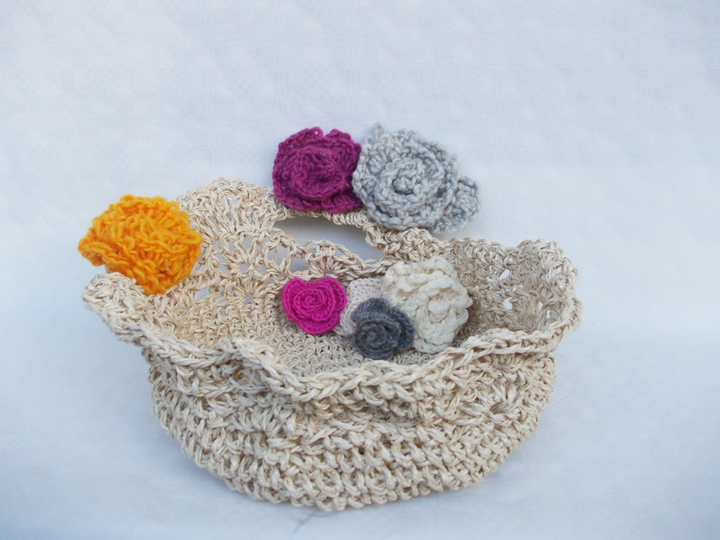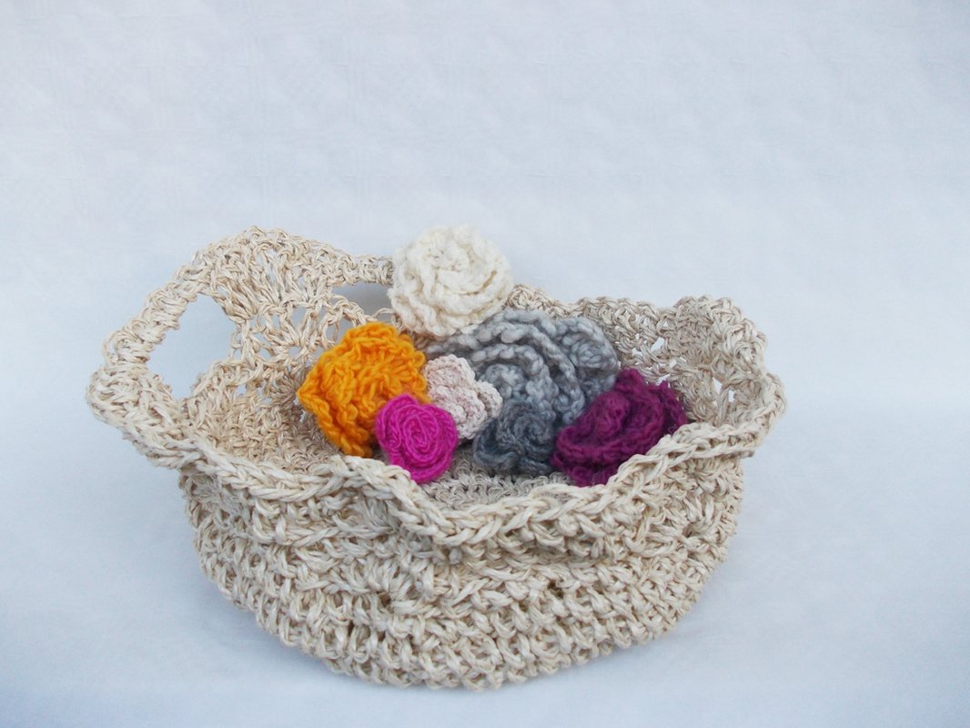 Verziert mit Häkelblumen sieht der Korb bezaubernd aus, hier einige Links für Häkelanleitungen für Häkelblumen in meinem Shop: