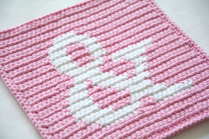 Neben der schriftlichen Anleitung für den Ampersand-Topflappen sind ein Häkelschema in Farbe und ein Häkelschema in schwarz-weiß enthalten.