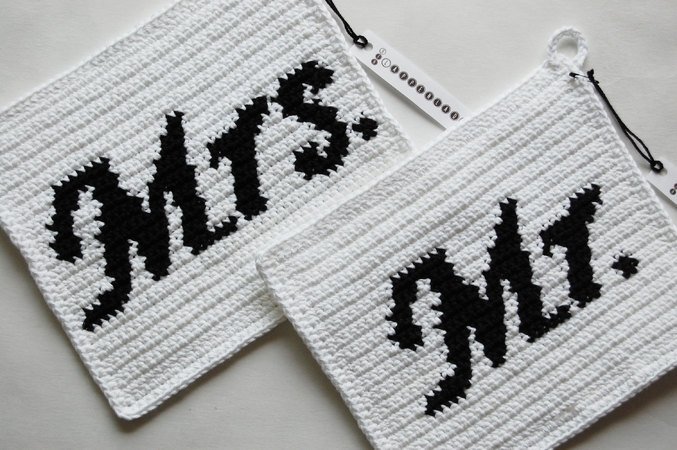 Neben der schriftlichen Anleitung für die Mr. und Mrs.-Topflappen sind ein Häkelschema in Farbe und ein Häkelschema in schwarz-weiß enthalten.