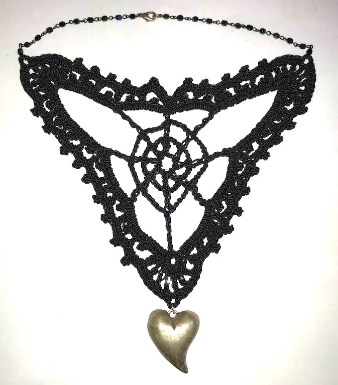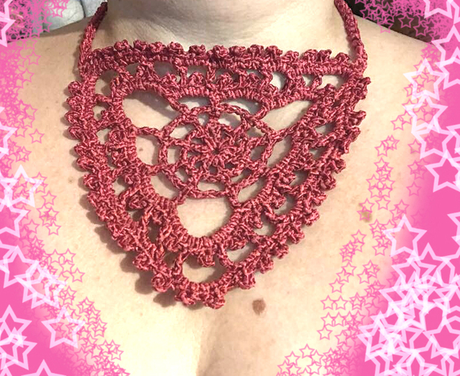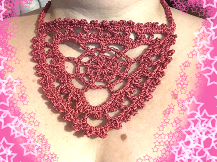ich nehme hier eine festere Wolle... man kann das Collier auch nachträglich noch mit Perlen besticken...eine Kette einhängen, oder einen Anhänger an die Spitze nähen.