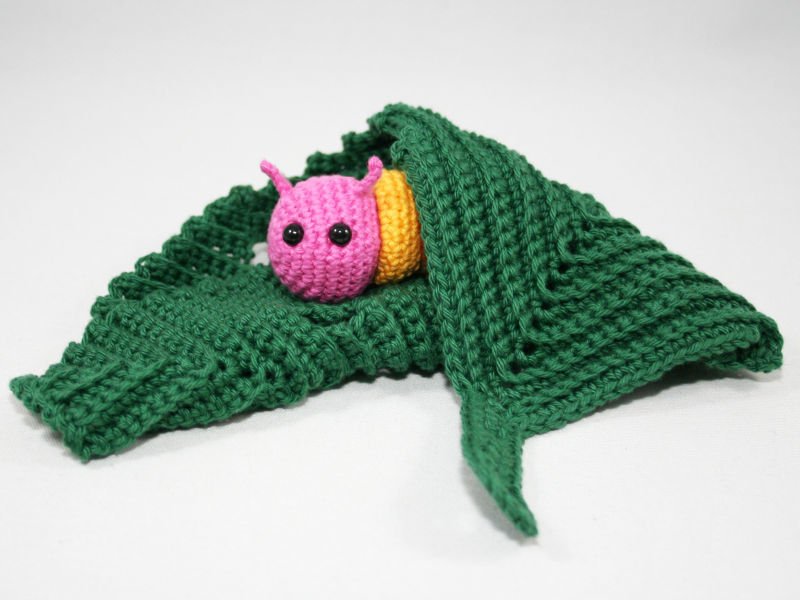 Ein süßes Schnuffeltuch in Form einer kleinen Raupe auf ihrem Blatt.