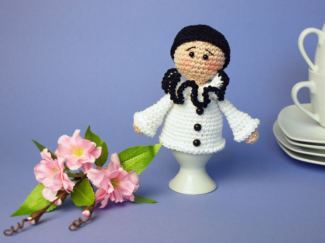 Die Eierwärmer Pierrots passen unter Verwendung der angegebenen Materialien auf ein Hühnerei der Größe M.