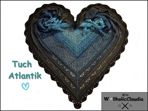 Da dieses Tuch in Farben des "Atlantik gehalten ist, hat es genau diesen Namen erhalten. Die unterschiedlichen Musterfolgen gehen wirklich gut von der Hand und so ist das Tuch mit einer Spannweite von 2,25 m und der Tiefe von 0,98 m schnell angefertigt.