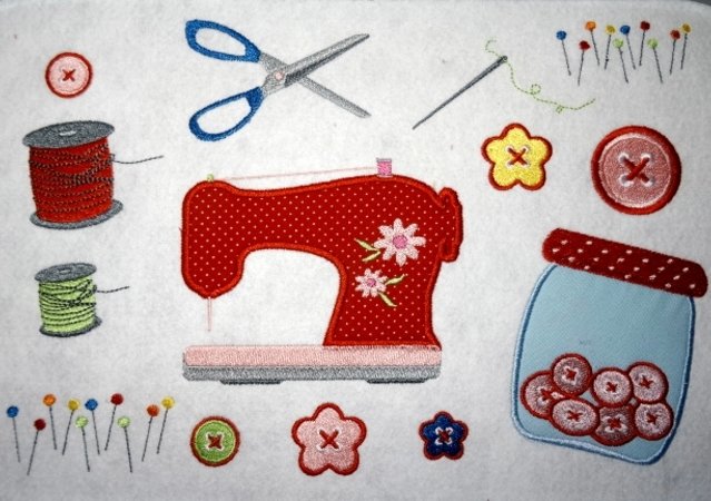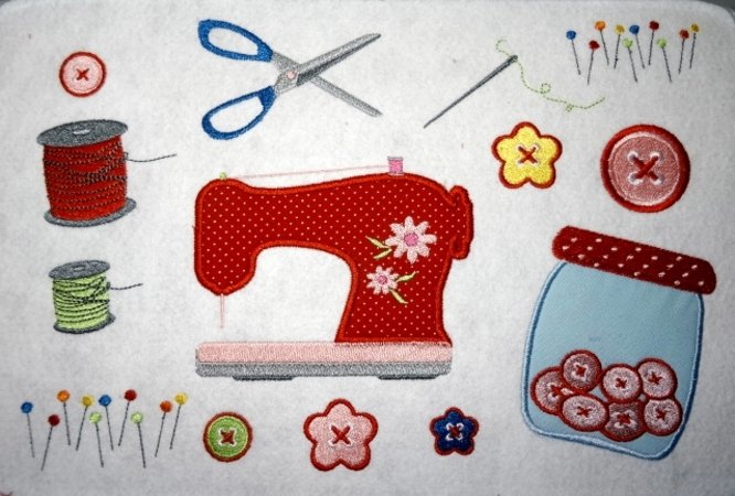 ♥ Stickdatei Sewing mit Nähmaschine, Nadelkissen, Nähnadel, Stecknadel, Knöpfen, Knopfglas, Garnrolle und Schere ♥