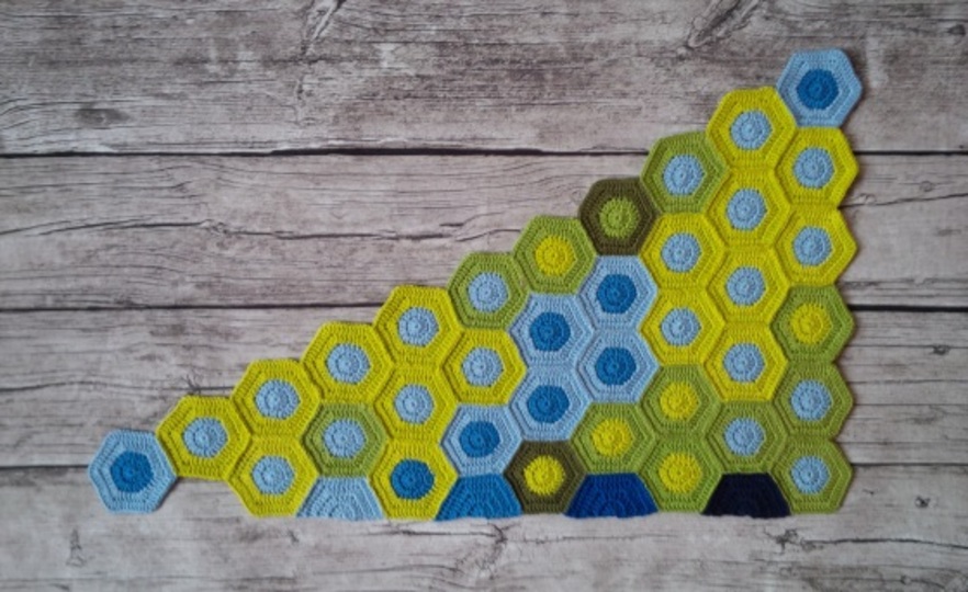 Jedes Sechseck entspricht der jeweiligen Tagestiefst- und Tageshöchsttemperatur. Die Decke wird in der Diagonale von einer Ecke zur anderen gearbeitet. Die Farbe wechselt alle 4 °.
