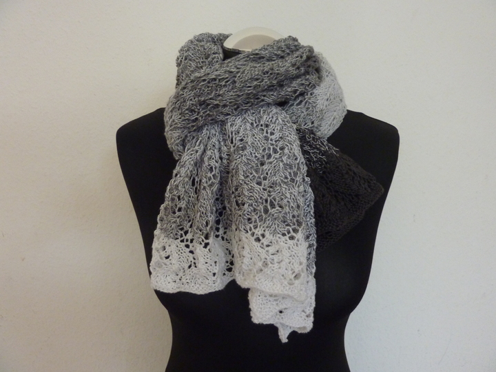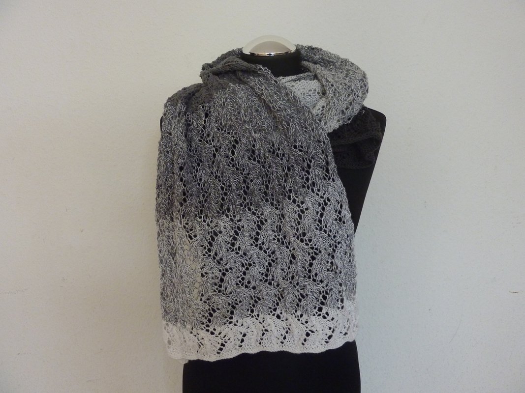Unter Verwendung des angegebenen Materials wird der Schal "Grey" 1,80 m lang, kann jedoch, in dem man den Mustersatz immer weiter wiederholt, auch länger gearbeitet werden.