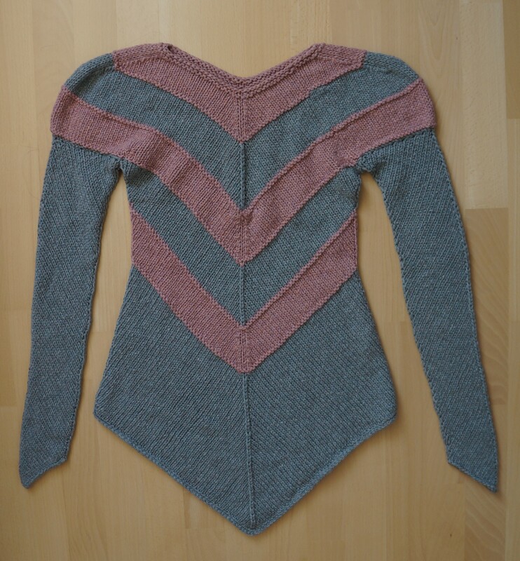 Bis auf jeweils eine kleine Nahtstelle zwischen Ärmel und Hauptteil wird der Pullover ohne Nähte gestrickt.