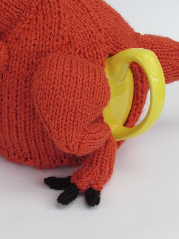The eye is an 18mm safety eye that is actually a cat's style eye with a slit pupil. I designed the tea cosy with a burnt orange colour, but it could be knitted in any colour.