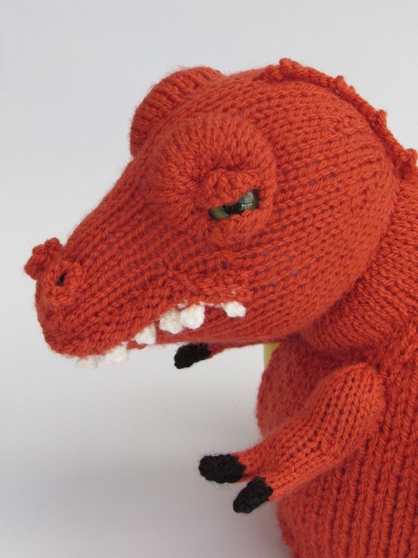 I researched as much as I could the 'arms' and legs, and I have tried to keep true to how scientists believe that the T-rex looked. Pretty tricky with just knitting.