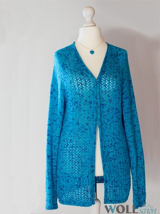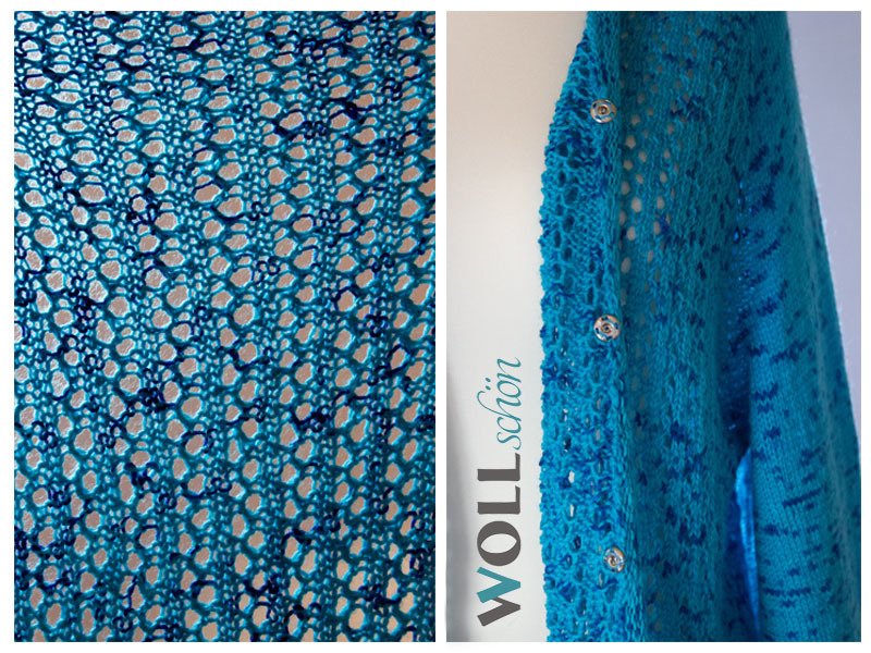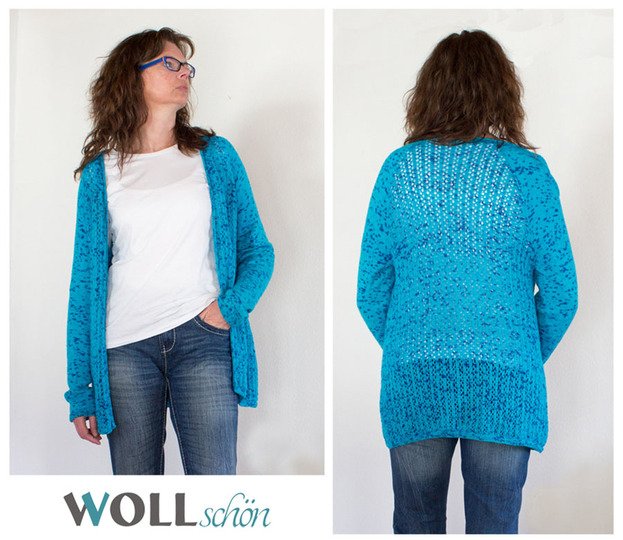 Die Jacke "Ein Tag am Meer" wird nahtlos an einem Stück als klassischer Raglan von oben gestrickt. Die Ärmel glatt rechts, Voder- und Rückenteile in einem eingängigen Lacemuster.