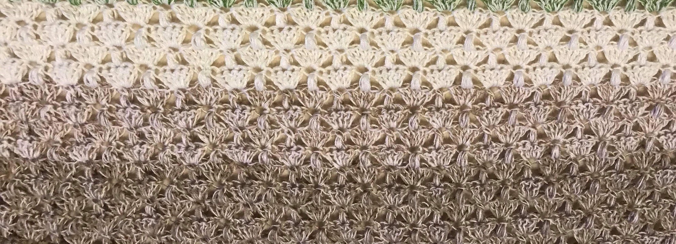 Gehäkelt wird von unten nach oben. Benötigt werden Grundkenntnisse beim Häkeln von Luftmaschen, Stäbchen, Doppelstäbchen und Büschelmaschen (sind in Schrift beschrieben). Das Tuch wurde mit einem dreifädigen Farbverlaufsgarn gehäkelt. Verwendet wurden ca. 1000 Meter. Damit hat das Tuch eine Größe von etwa 180 x 52 cm. Man kann natürlich auch mehr Lauflänge verwenden um ein größeres Ergebnis zu erzielen, indem man den Mustersatz einfach beiebig wiederholt.
