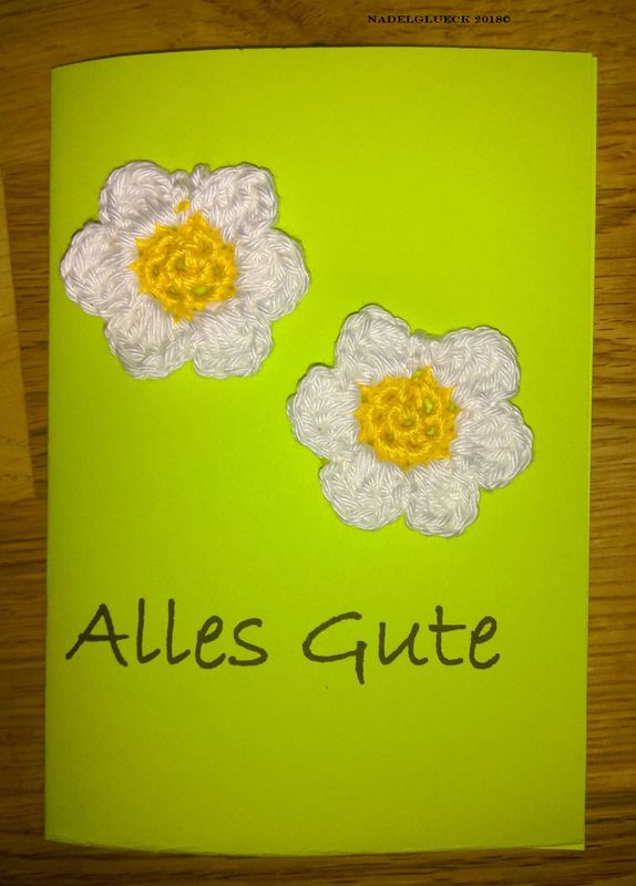 Bei dieser Karte kann die oder der Beschenkte die Häkelblümchen weiterverwenden. Da die Blumen eine Schlaufe zum Aufhängen haben, machen sie sich gut als Schmuck am Osterstrauß, an Schubladenknöpfen, am Schlüsselring oder ... oder ... oder....