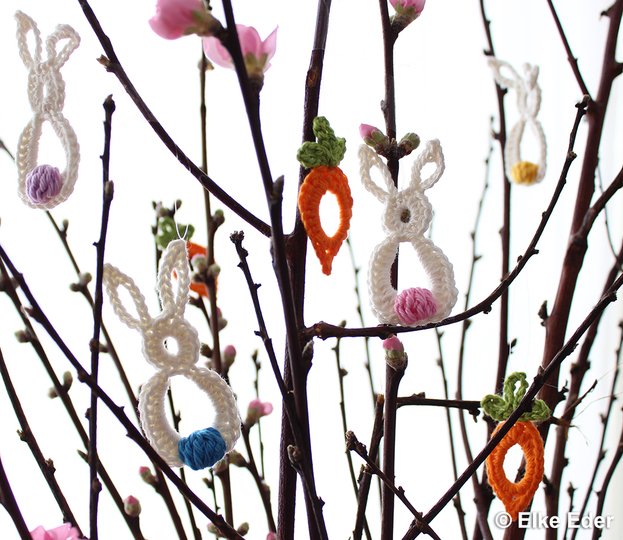 Diese süßen Hasen mit ihren bunten Schwänzchen sind vielseitig verwendbar. Egal ob am Osterstrauch, als Tischdeko, im Osternest, am Schlüsselbund oder an einem kleinen Geschenk - sie sind immer ein liebevoller Blickfang... und ihr Futter haben sie auch schon dabei.