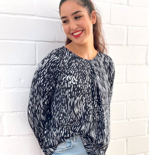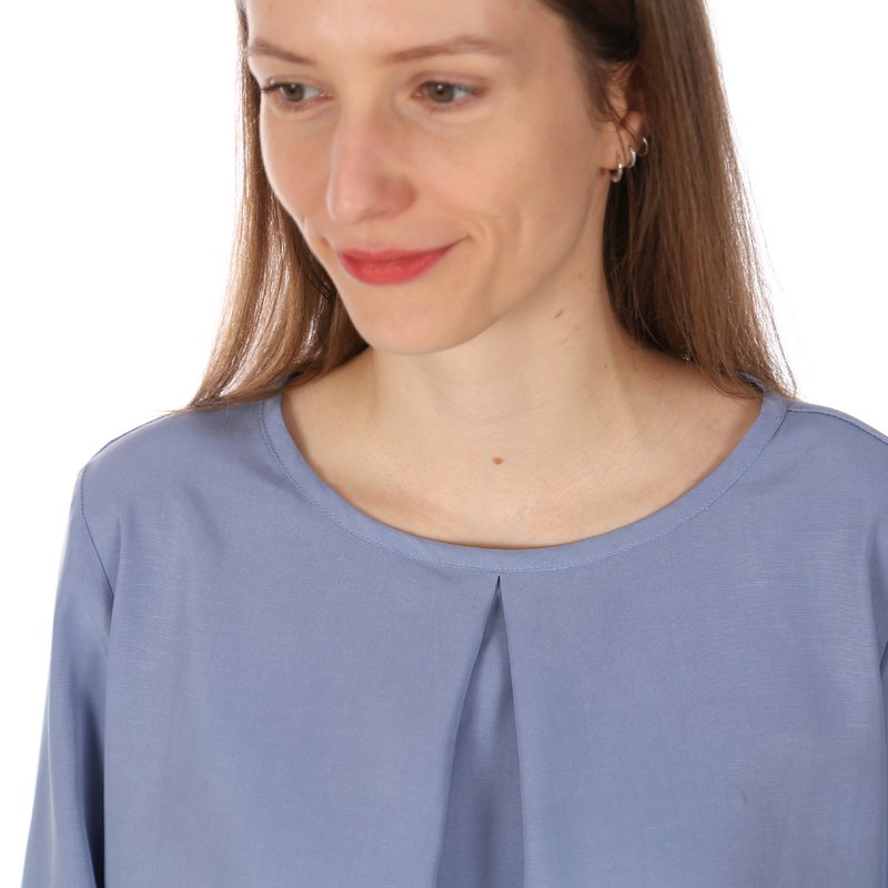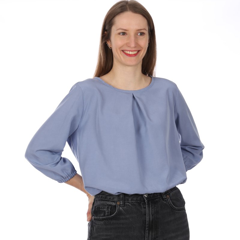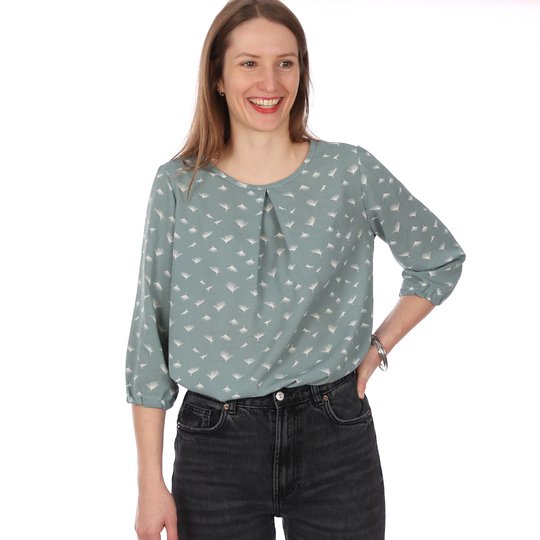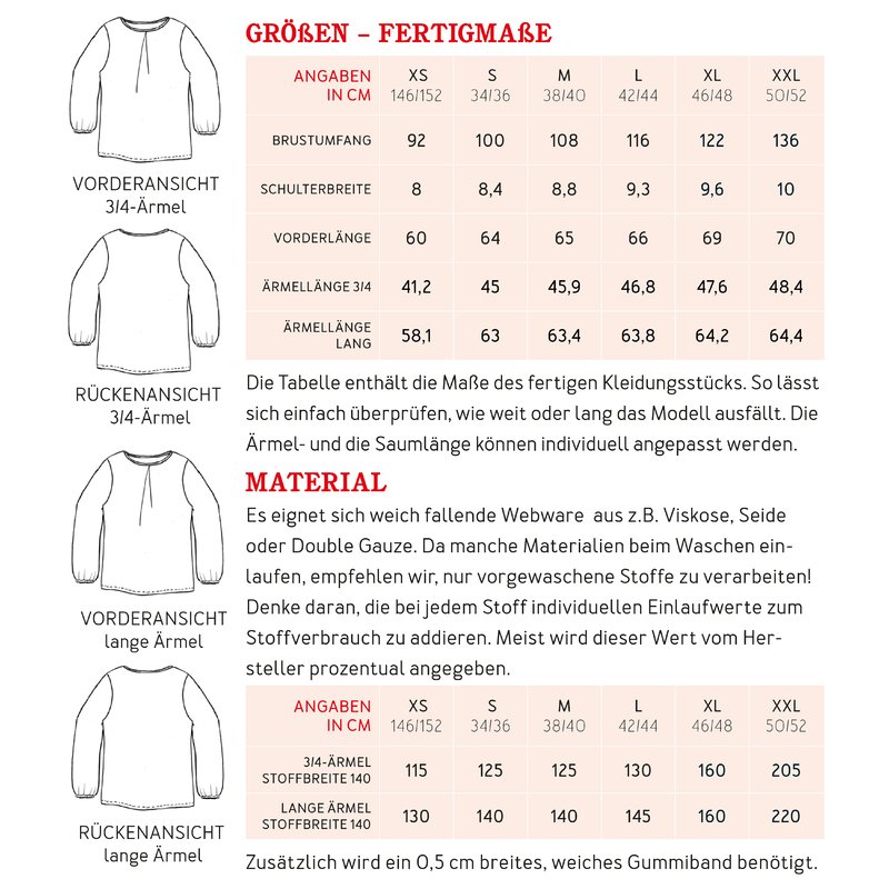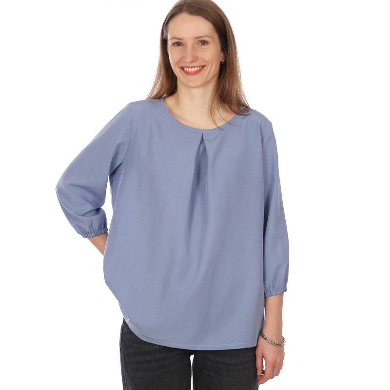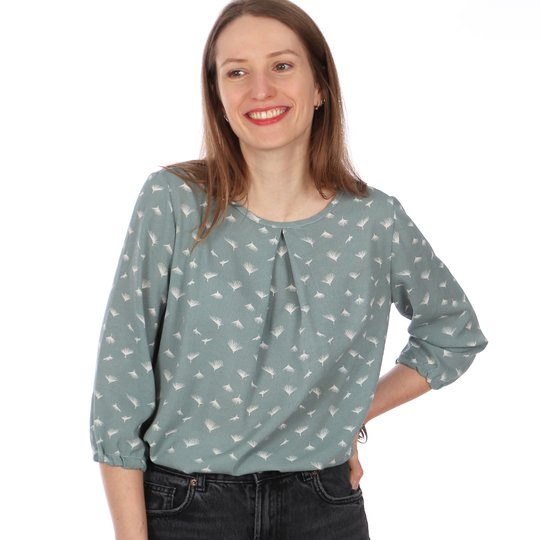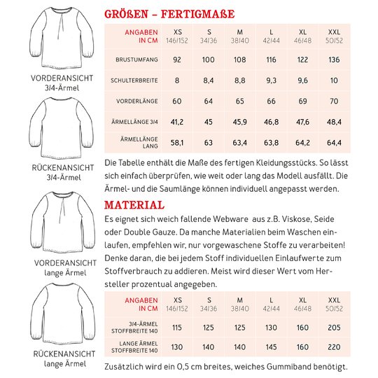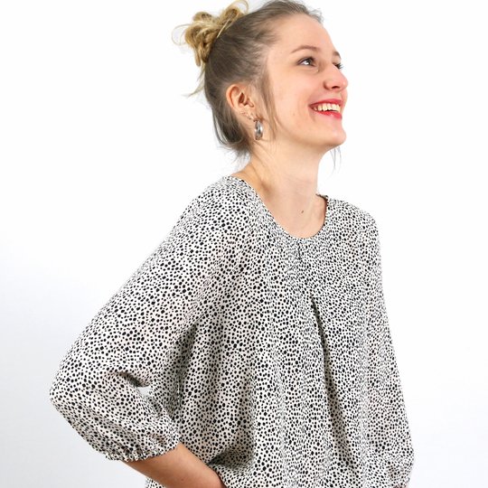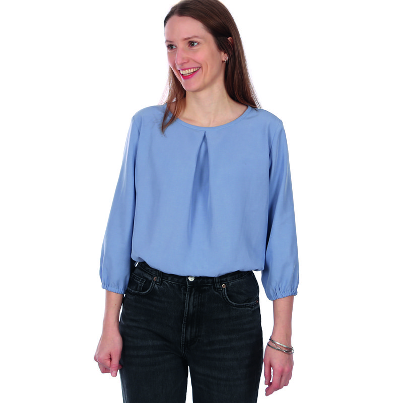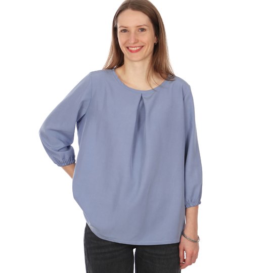 FRAU SUKI ist eine entspannte Bluse für jede Gelegenheit. Eine Kellerfalte im Vorderteil gibt ihr eine lockere Weite. In den Ärmelsaum wird ein Gummiband eingearbeitet, je nach Jahreszeit und Geschmack kannst Du zwischen langen und 3/4-Ärmeln wählen. Uni oder gemustert, FRAU SUKI ist ein eleganter Klassiker, der Dich über Jahre begleiten kann.