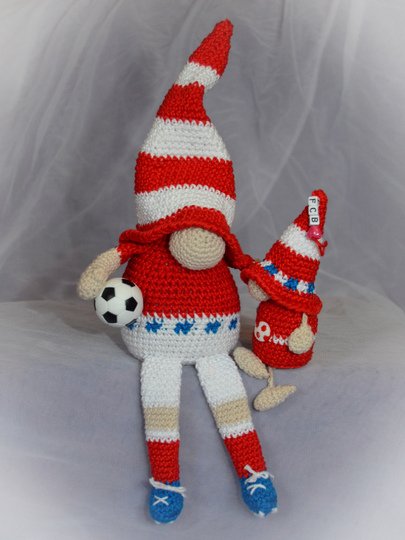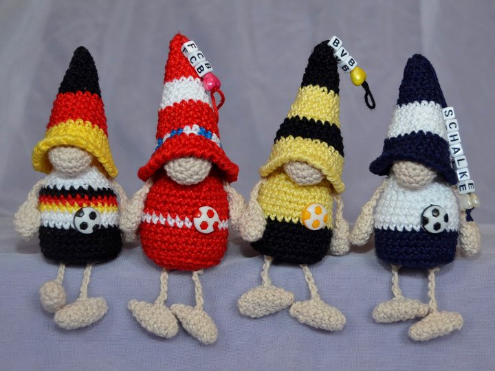 Du kannst deinen Wichtel im Look der deutschen Nationalmannschaft oder natürlich in den Farben deines Lieblingsvereins häkeln.