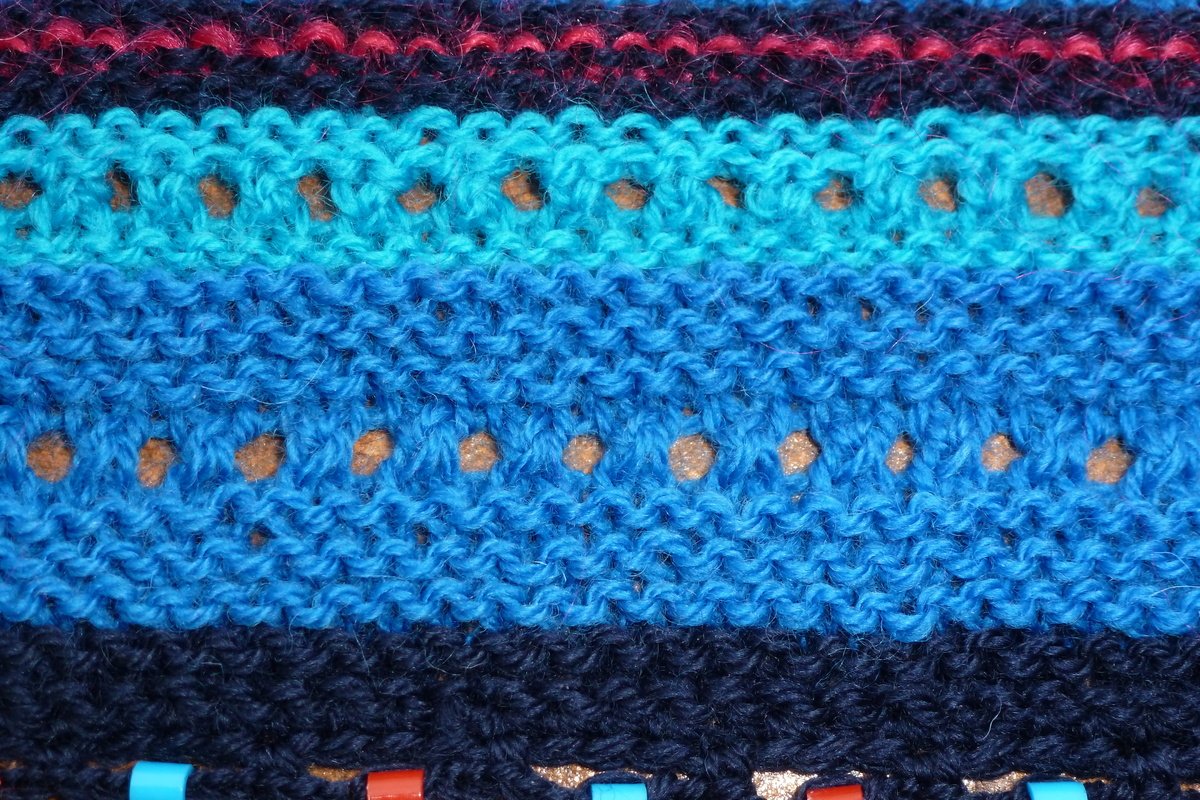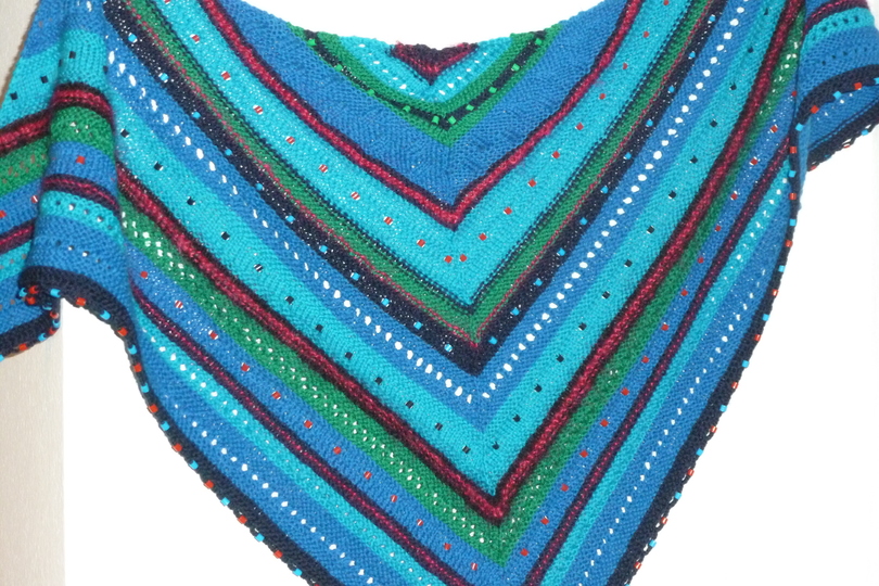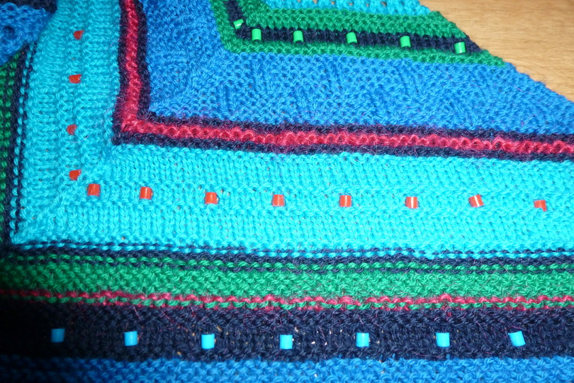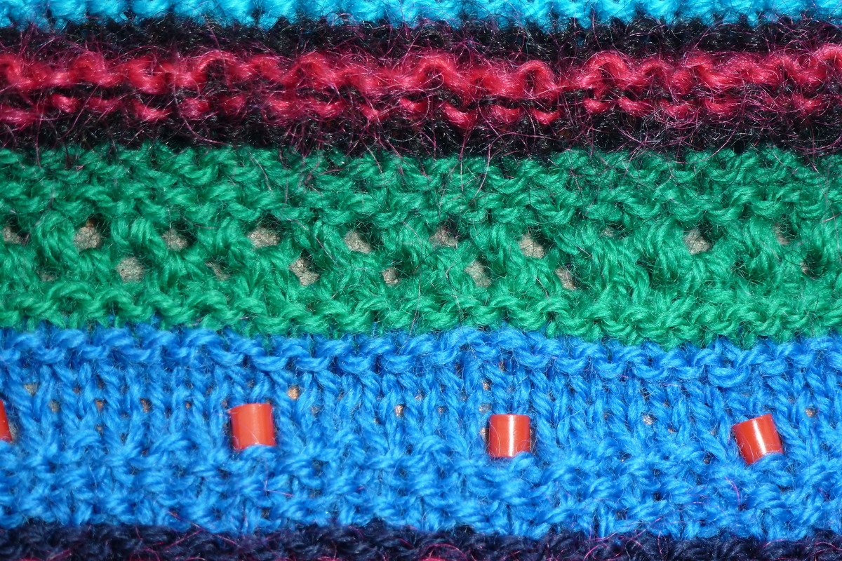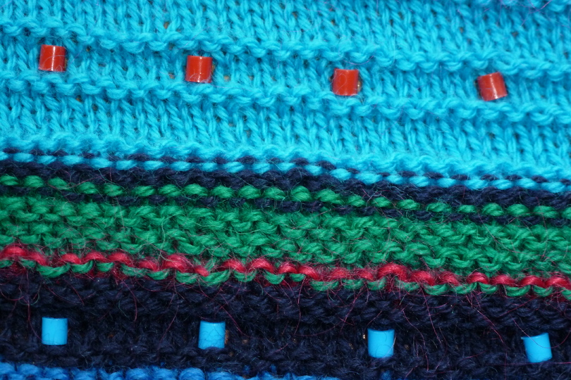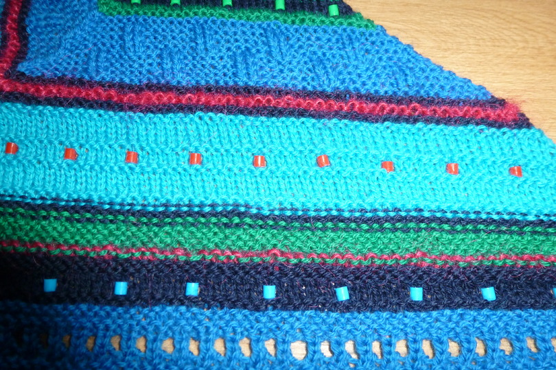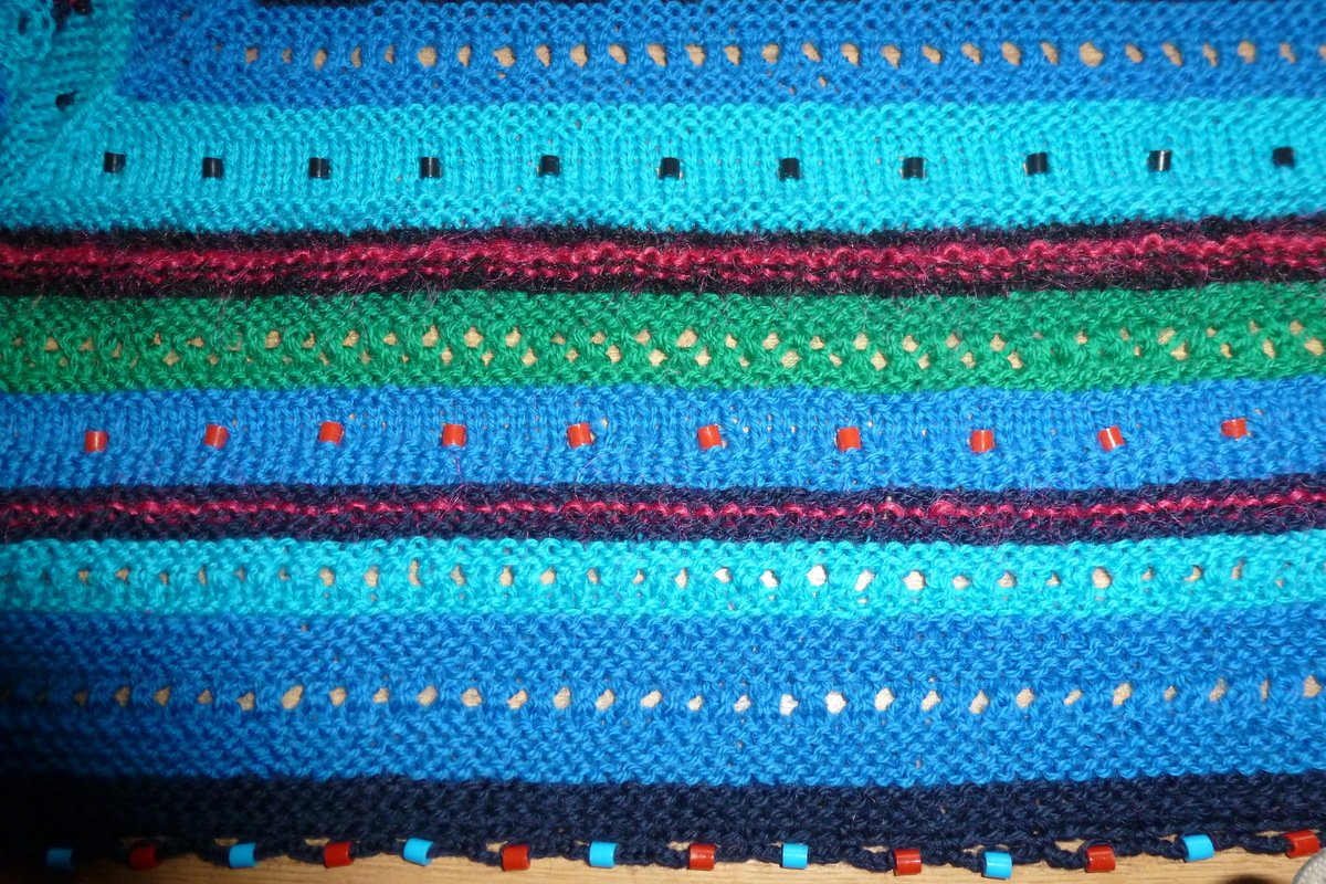 mit vielen Farben und Mustern und eingestrickten Perlen,