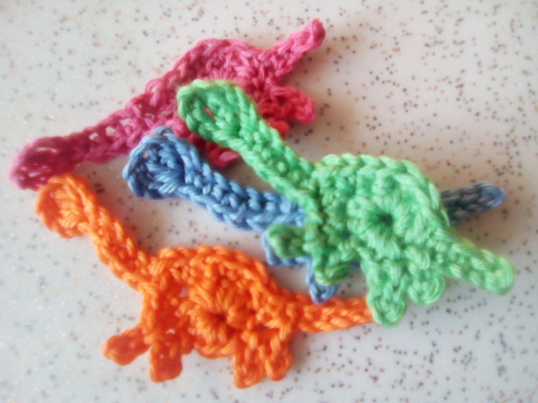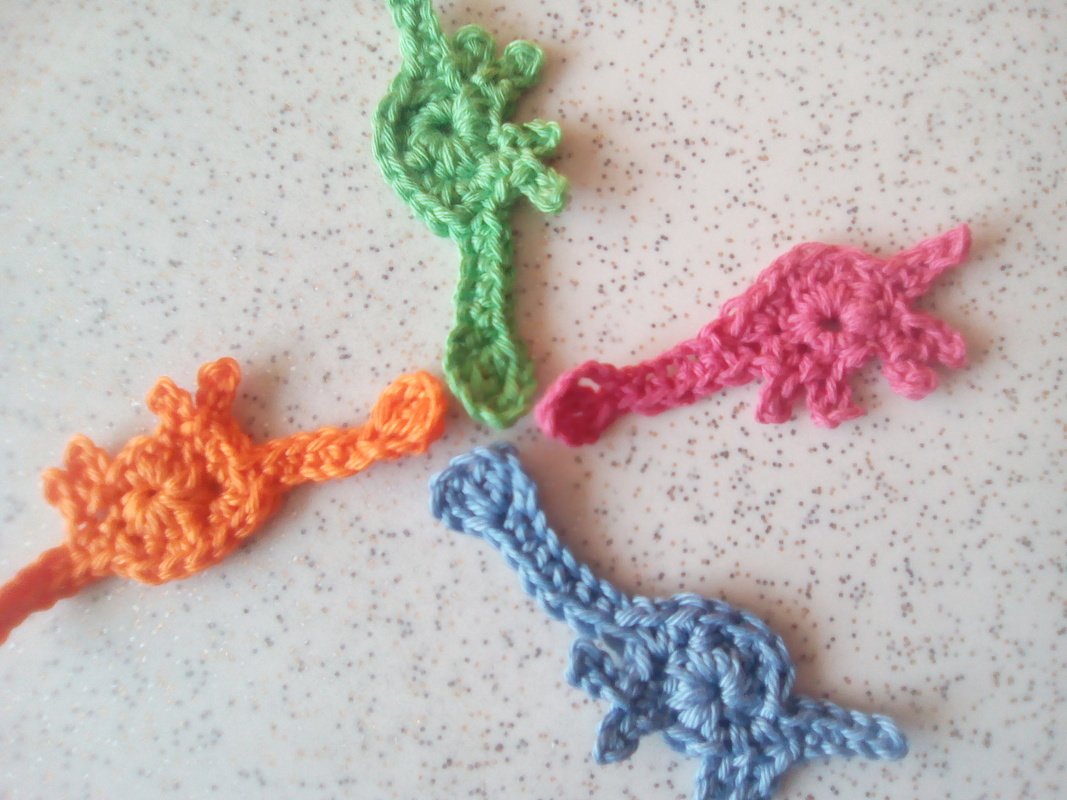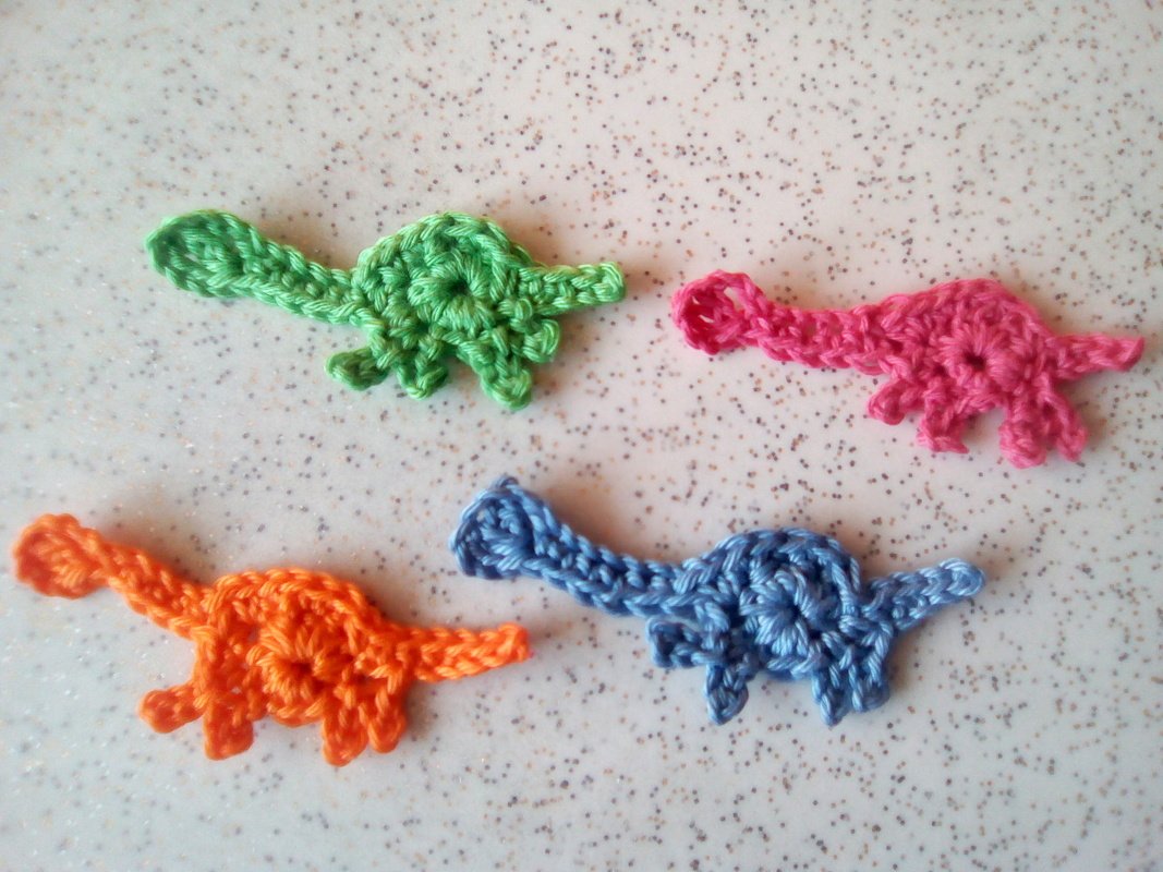 Diese süßen Dinos warten darauf gehäkelt zu werden. Danach können sie als Applikation, Brosche, Haarspange, etc. verwendet werden.