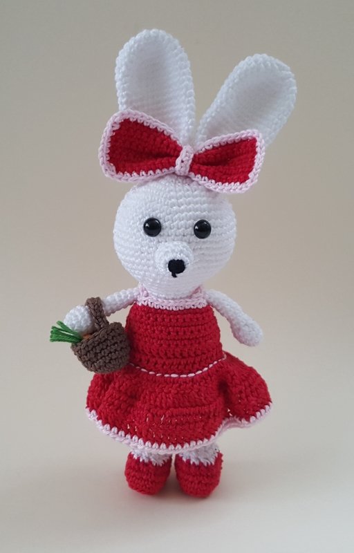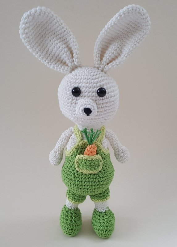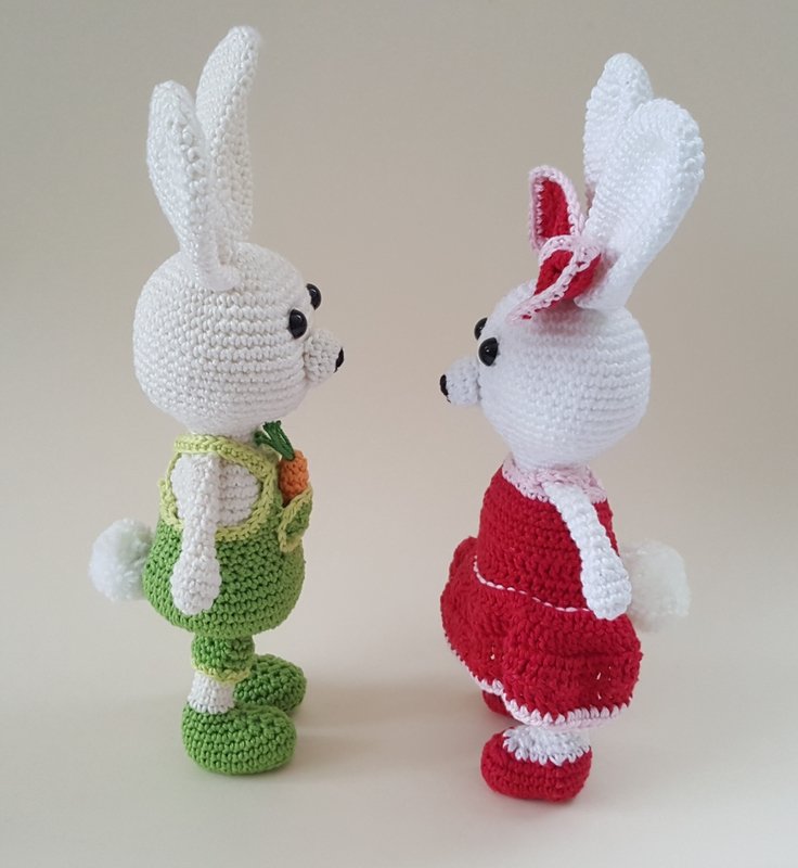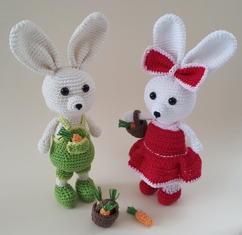 Die PDF beeinhaltet die Anleitungen für: Häschen Lilly, Häschen Tim, deren Kleidungsttücke sowie Korb und Karotten.