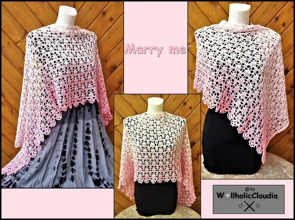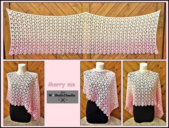Diese gehäkelte Stola namens "Marry me" hat ein sehr feines- und edles Muster und ist perfekt für Hochzeiten oder andere festliche Gegebenheiten. Das Muster ist beidseitig tragbar, ob als Schal, Tuch, Stola oder Überwurf, hier sind viele Tragevarianten möglich.