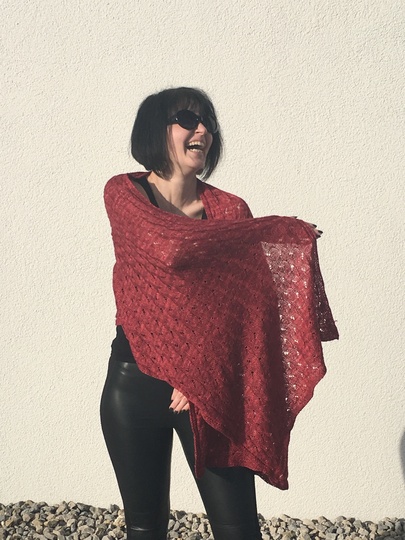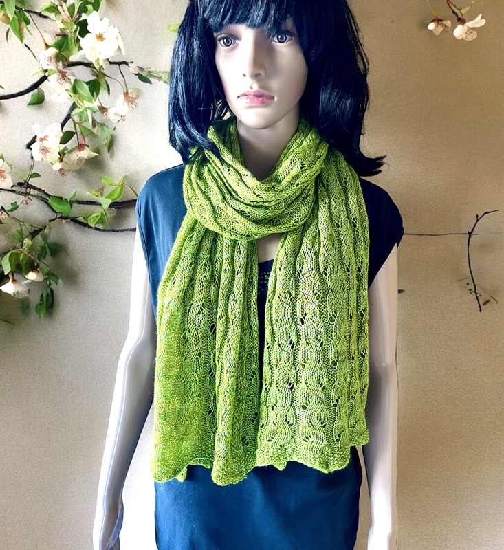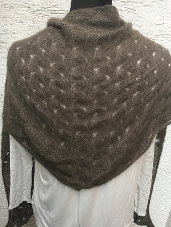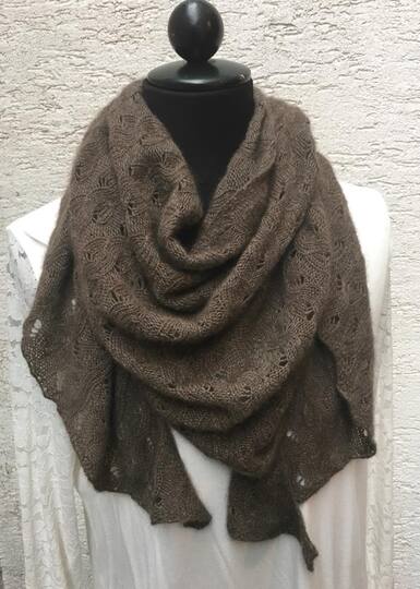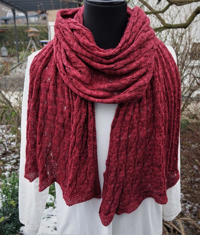 Da mir das Muster so gut gefiel, habe ich auch noch eine Stola aus 200g Silken BFL Lace gemacht, das sind insgesamt 1200m. Hier beträgt die fertige Größe: