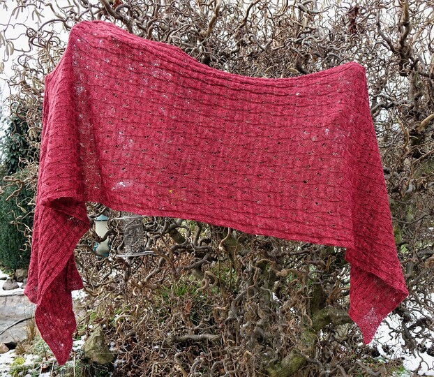 Bei dieser Wolle wirkt die Wolle und nicht das Muster, daher habe ich mich für ein einfaches Lochmuster entschieden. Die ca 700m sind für ein Dreieckstuch vollkommen ausreichend. Die fertigen Maße sind: