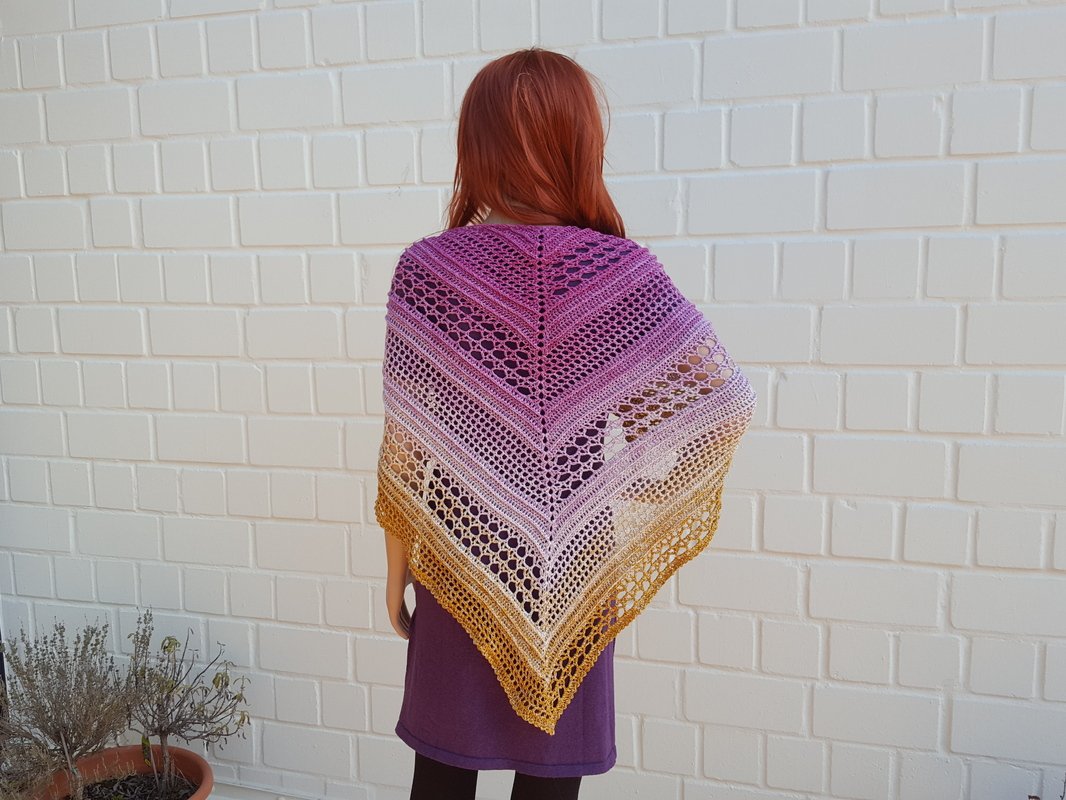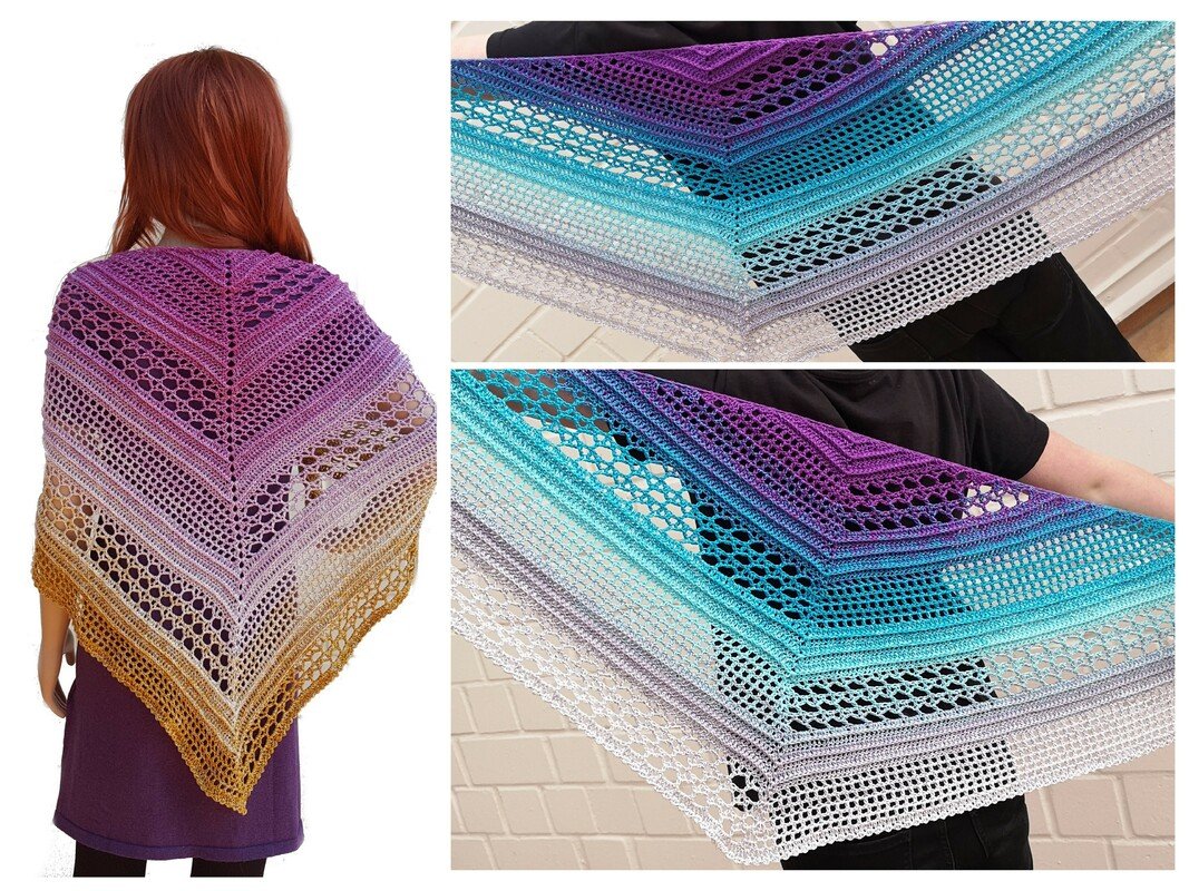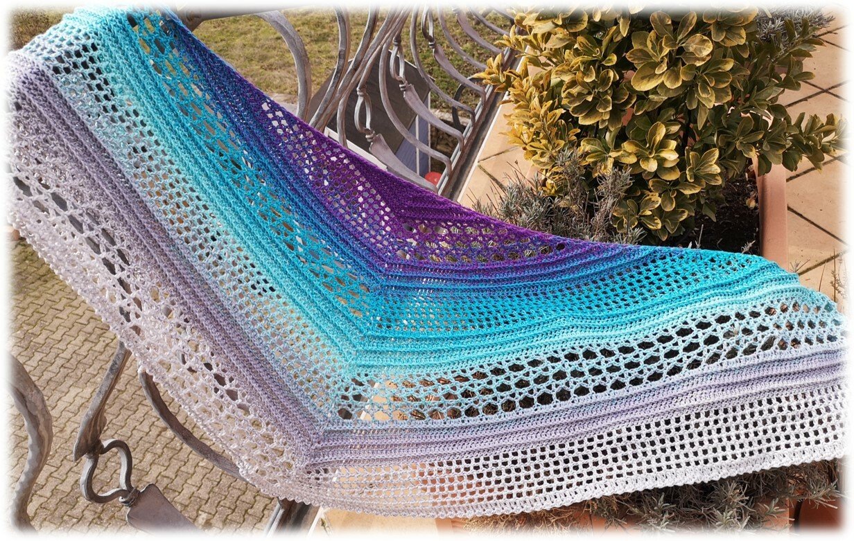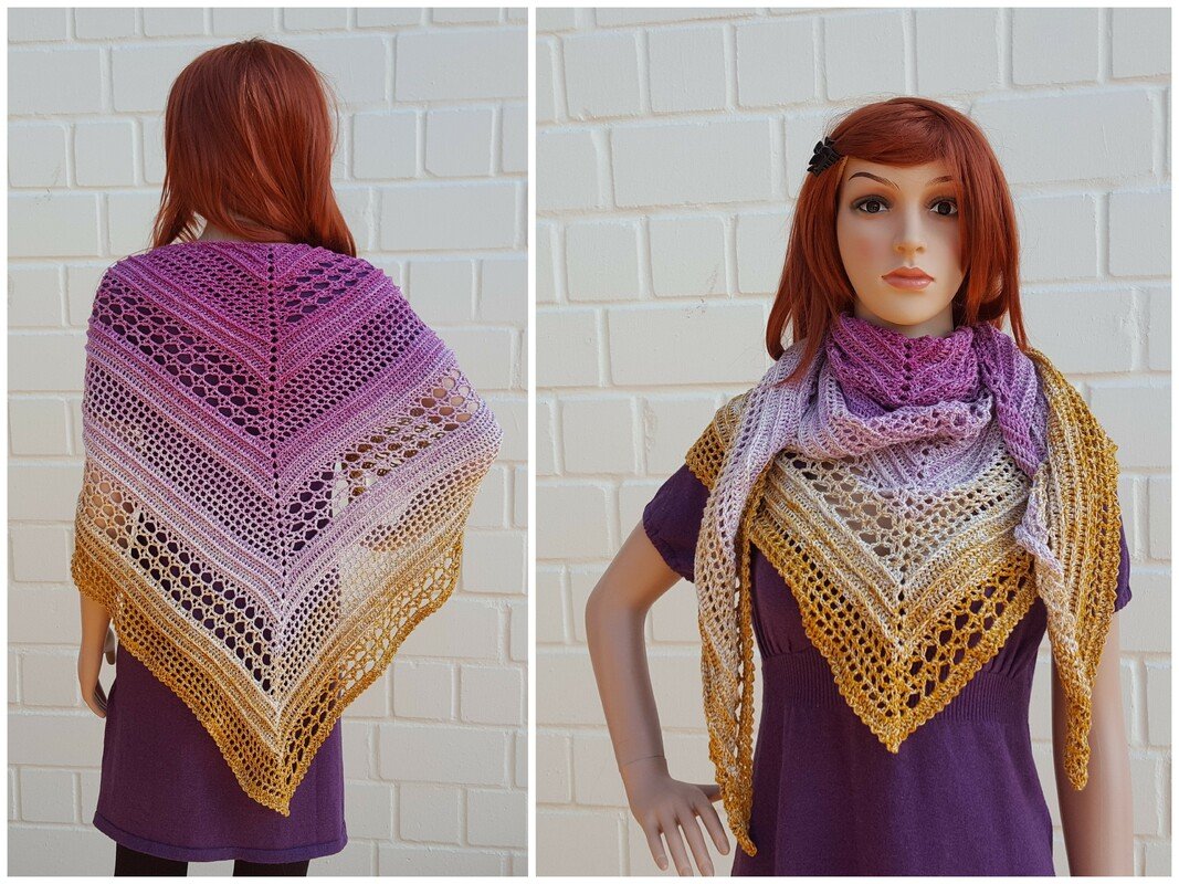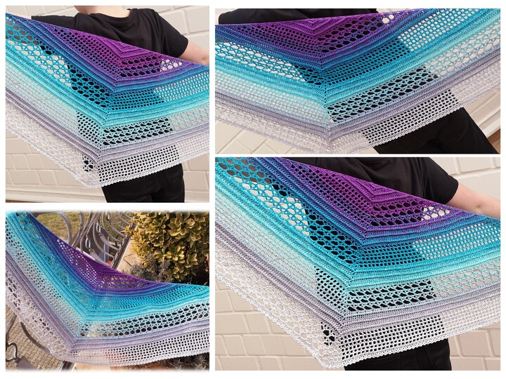 Die Anleitung beinhaltet 2 Versionen des Tuches. Einmal als normal spitzes Schultertuch und einmal in der flachen Version.