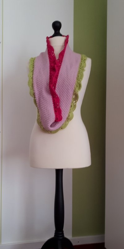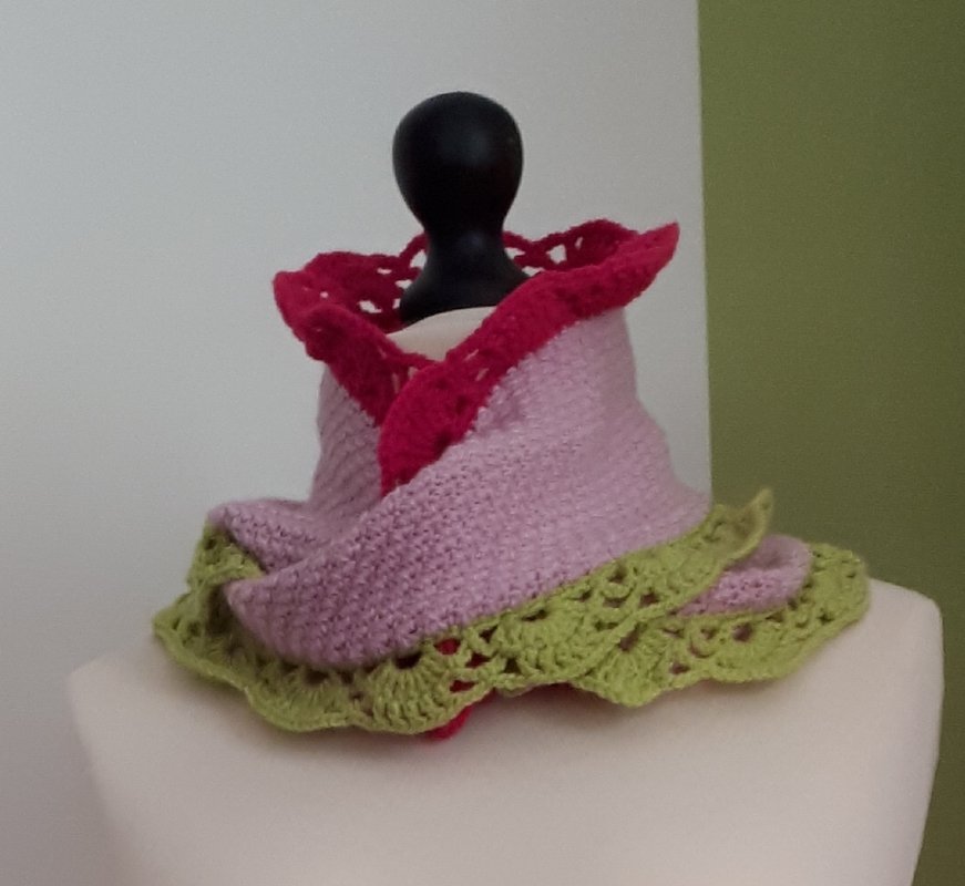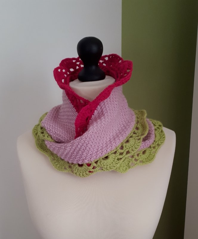 Der romantische Loopschal wird aus unterschiedlich dicken Woll- oder Acrylgarnen gehäkelt. Er schmiegt sich wärmend um den Hals und öffnet sich an der oberen Kante zu einem eleganten Kragen. An der unteren Kante liegt er auf den Schultern auf.