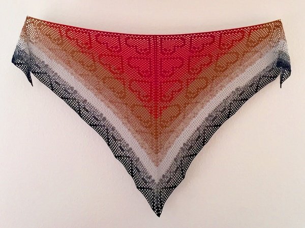 Wenn Sie mit dem angegebenen Garn und der genannten Nadelstärke arbeiten und die angegebene Maschenprobe gemacht haben, wird das fertige Tuch ca. 200 x 90 cm.