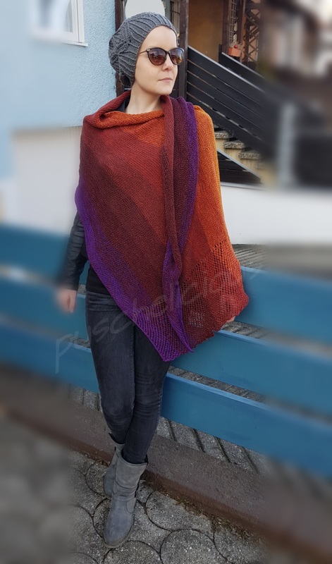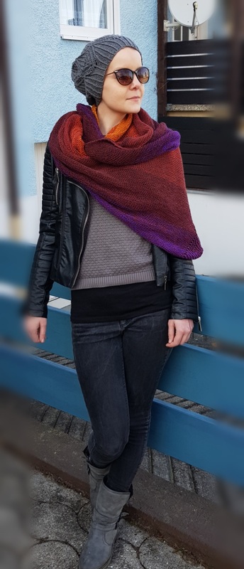 Durch seine langgezogene Form und seine Größe lässt es sich vielseitig tragen und bringt dabei die Farben des Garns voll zur Geltung.