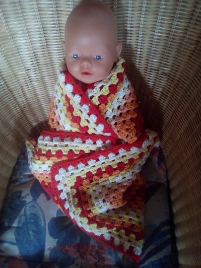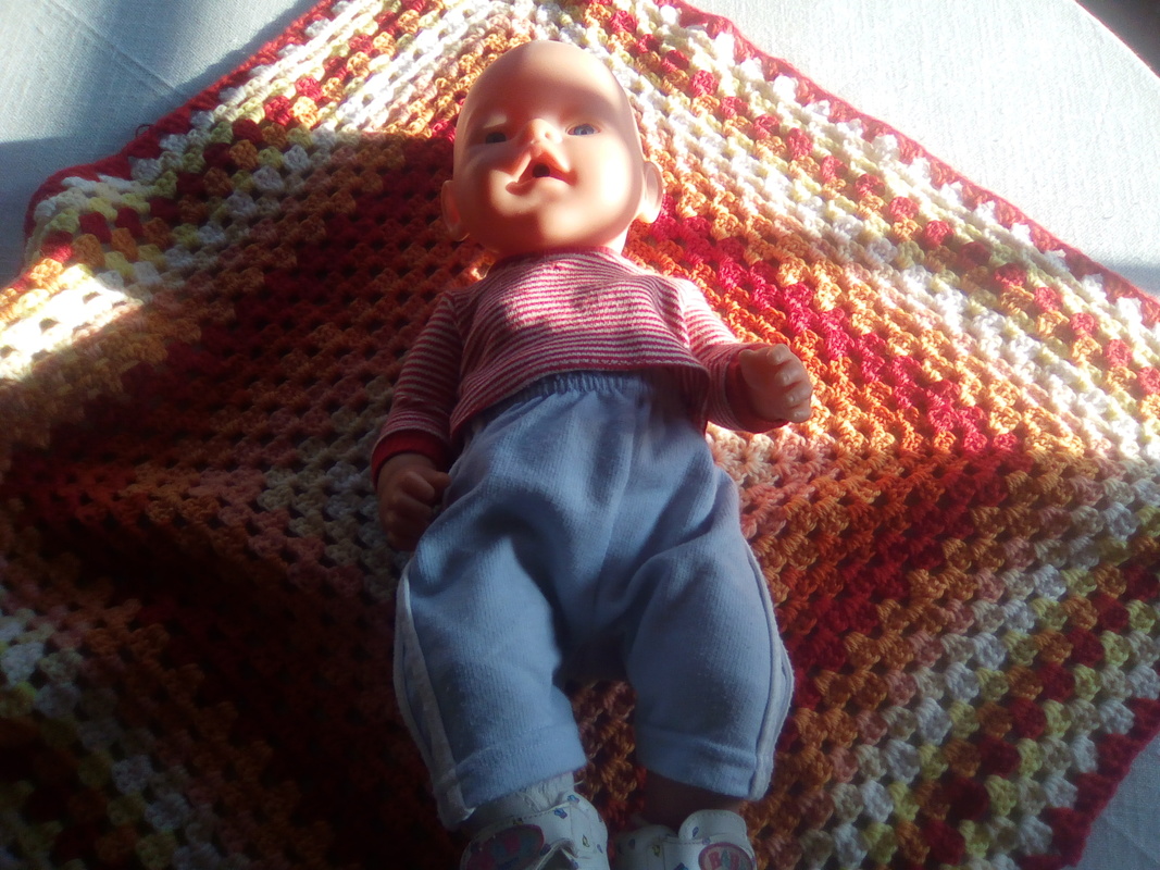 Diese Babydeckel im Granny-Style ist leicht zu häkeln. Sie entsteht in Runden aus der Mitte heraus. Die Größe ist variabel. Das vorgestellte Modell ist ca. 60 x 60 cm groß.