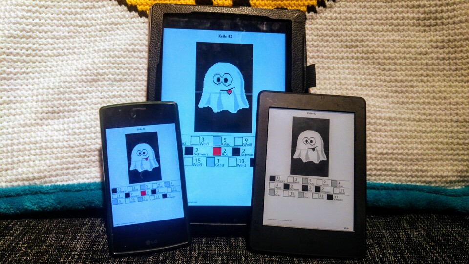 Die Anleitung enthält zusätzlich eine PDF Datei mit der genau abgezählten Maschenanzahl jeder Farbe pro Reihe. Diese Datei kann auf Tablet und / oder E- Book Reader geladen werden um auch unterwegs bequem häkeln zu können. :)