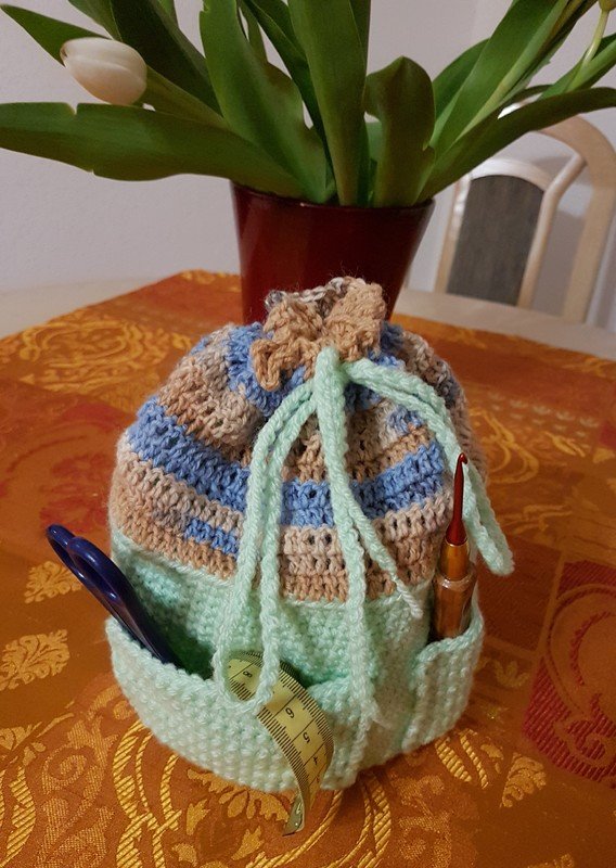 Die Tasche hat einen Durchmesser von 15,5 cm und eine Höhe von 11 cm plus Haube zum verschließen.