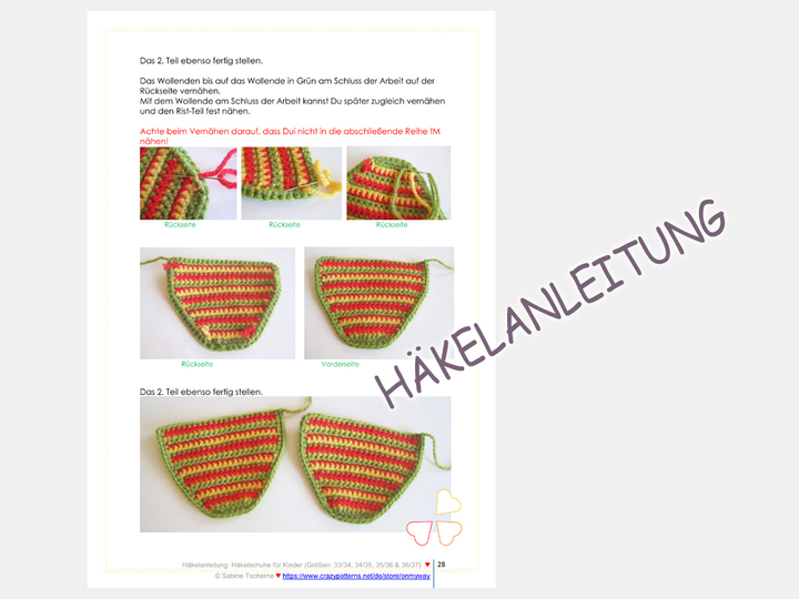 Alle Arbeitsschritt und Häkelmaschen werden in der Schritt-für-Schritt Anleitung sehr genau beschrieben und mit vielen Abbildungen veranschaulicht. Die Sohle ist doppelt gehäkelt. Die Anleitung umfasst daher auch 43 Seiten.
