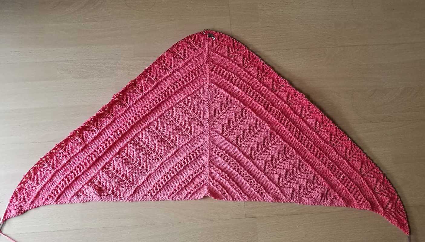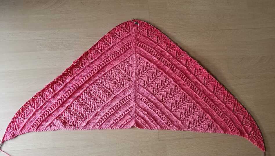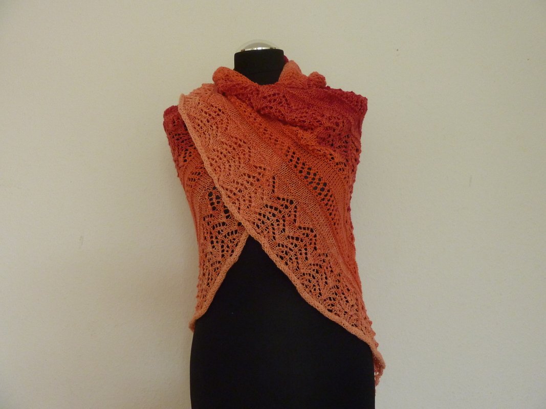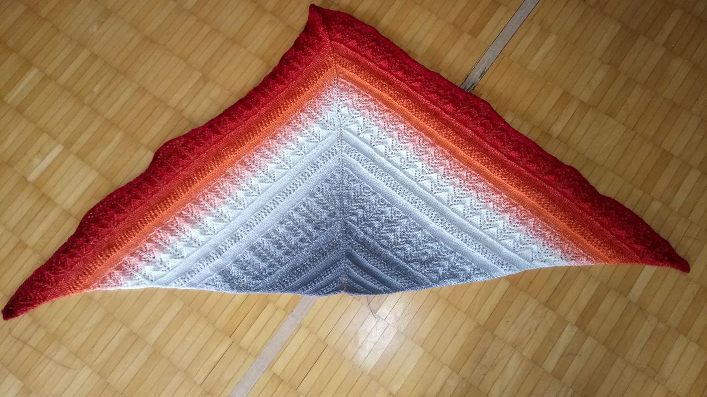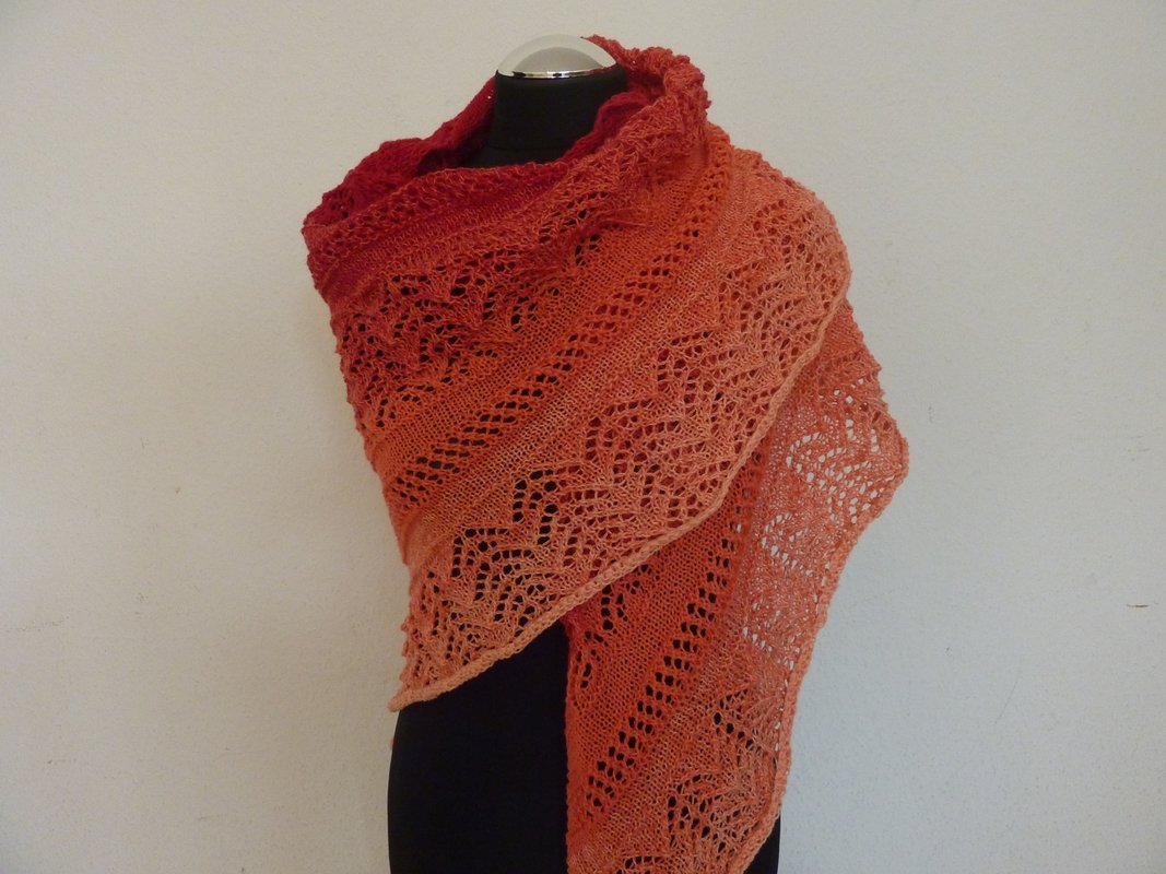 Das Tuch Sunset wird, unter Verwendung des angegebenen Materials, 180 x 90 cm groß. Und wie man auf den Kundenfotos sehen kann, ist es auch in einer anderen Farbkombination, oder auch uni, ein Hingucker.