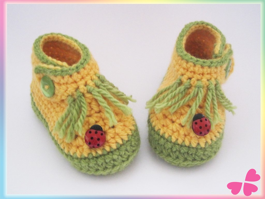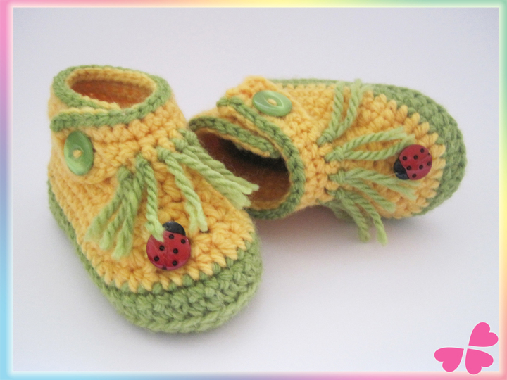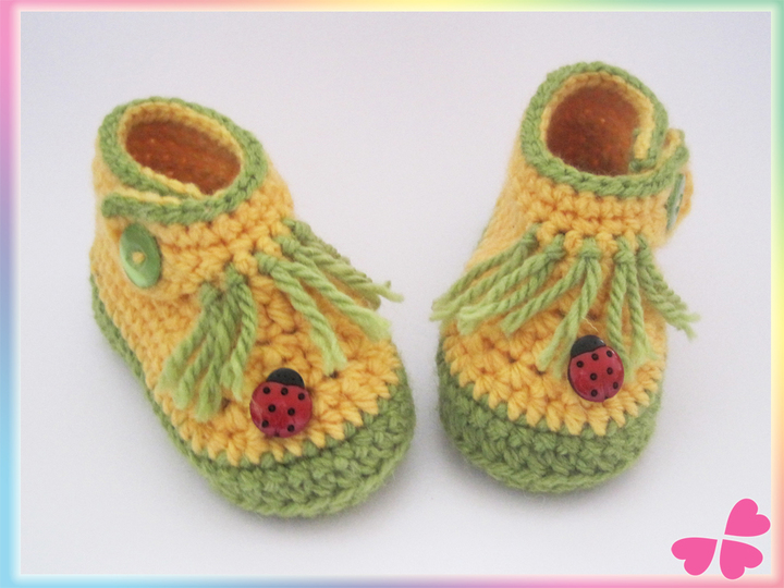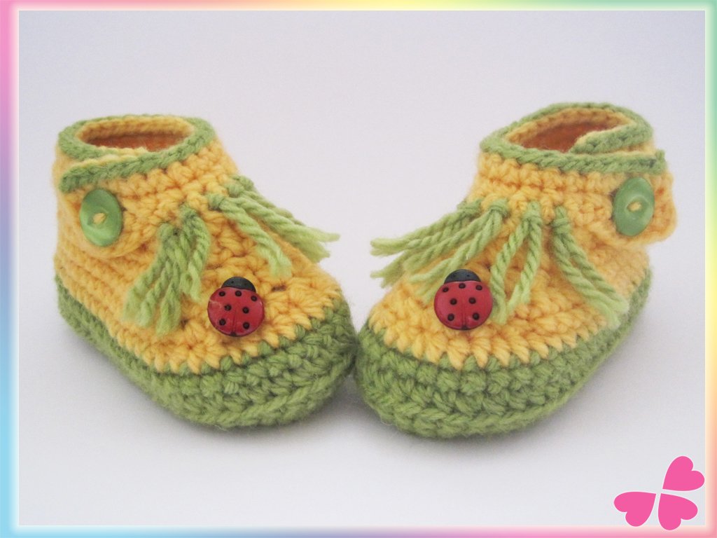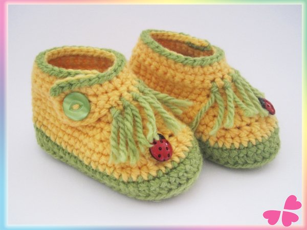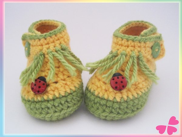 Häkelschuhe für Kinder: Marienkäfer im Gras!