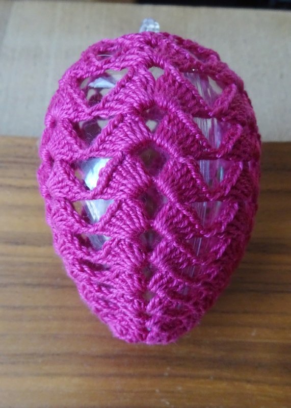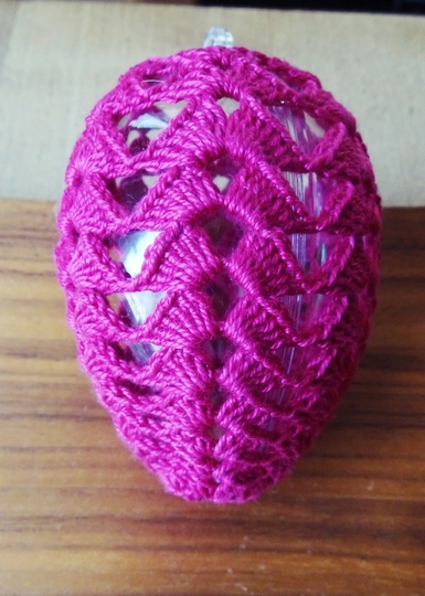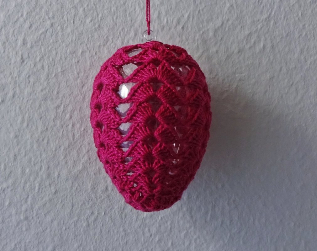 Das Muster besteht nur aus Stäbchen und Luftmaschen und es passt sich der Form des Häkel-Eies gut an.
