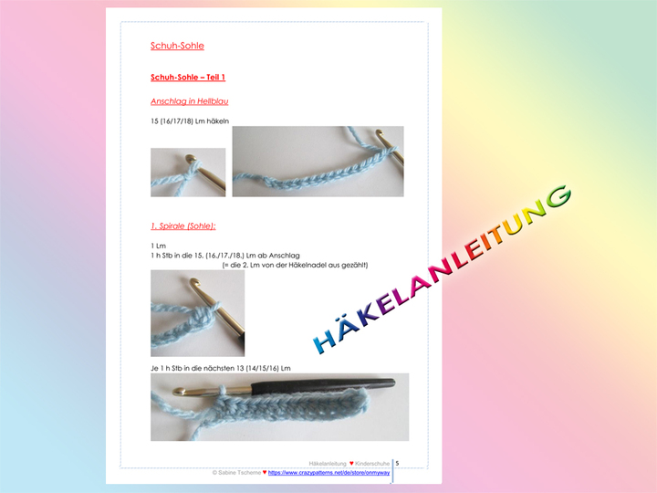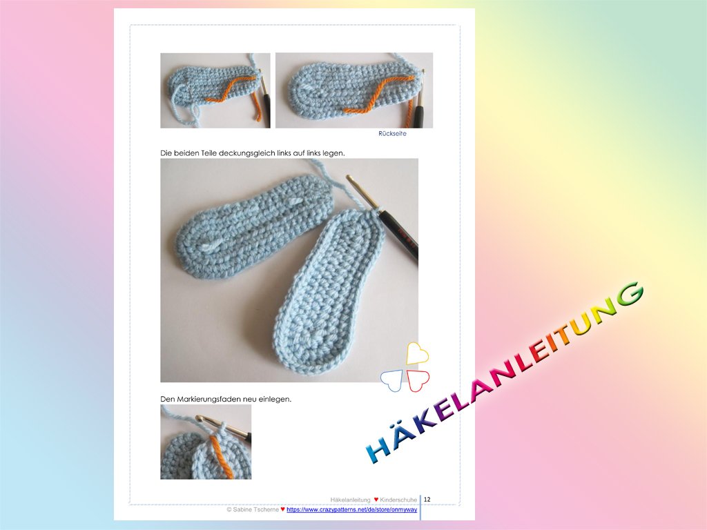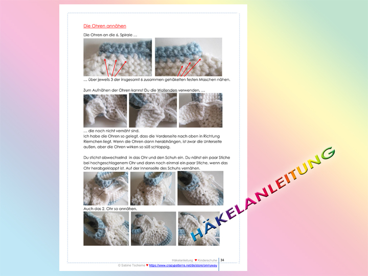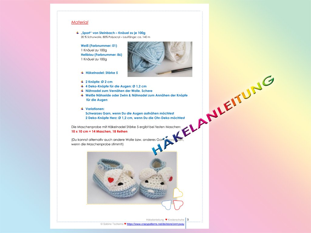 ♥ Die Anleitung ist anfängerfreundlich verfasst und hat 43 Seiten. Alle Arbeitsschritte und Häkelmaschen werden genau erklärt und mit vielen Abbildungen veranschaulicht. Die Schuhsohle wird doppelt gehäkelt. Für die Augen kannst Du Knöpfe verwenden. Ich zeige Dir aber auch, wie Du die Augen mit Wolle aufnähst und gebe Tipps, wie Du die Schuhsohle rutschfest machen kannst.