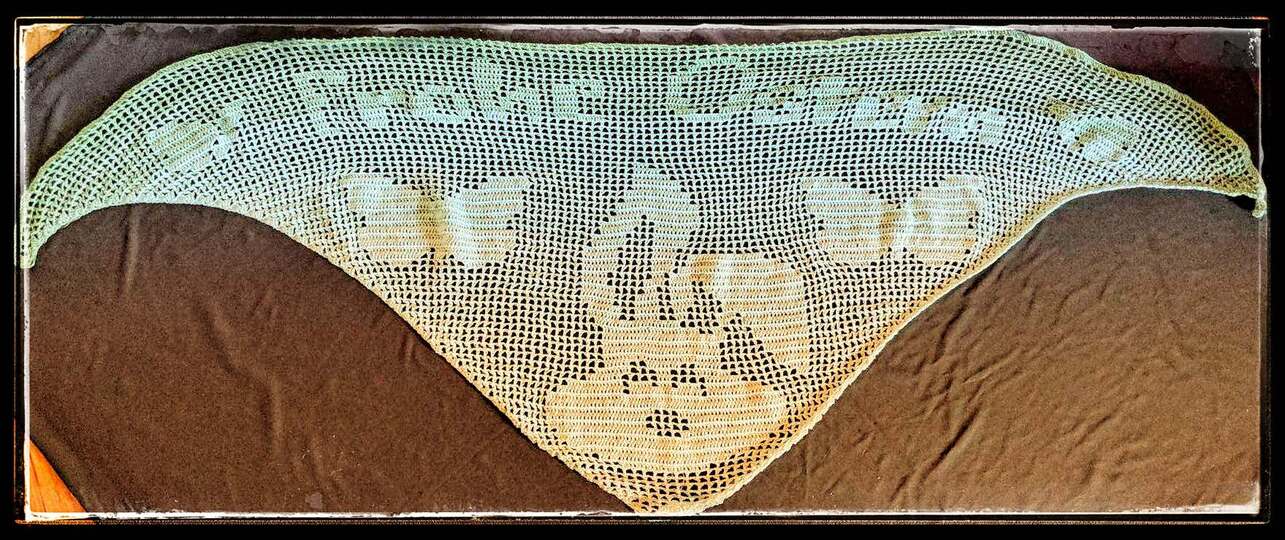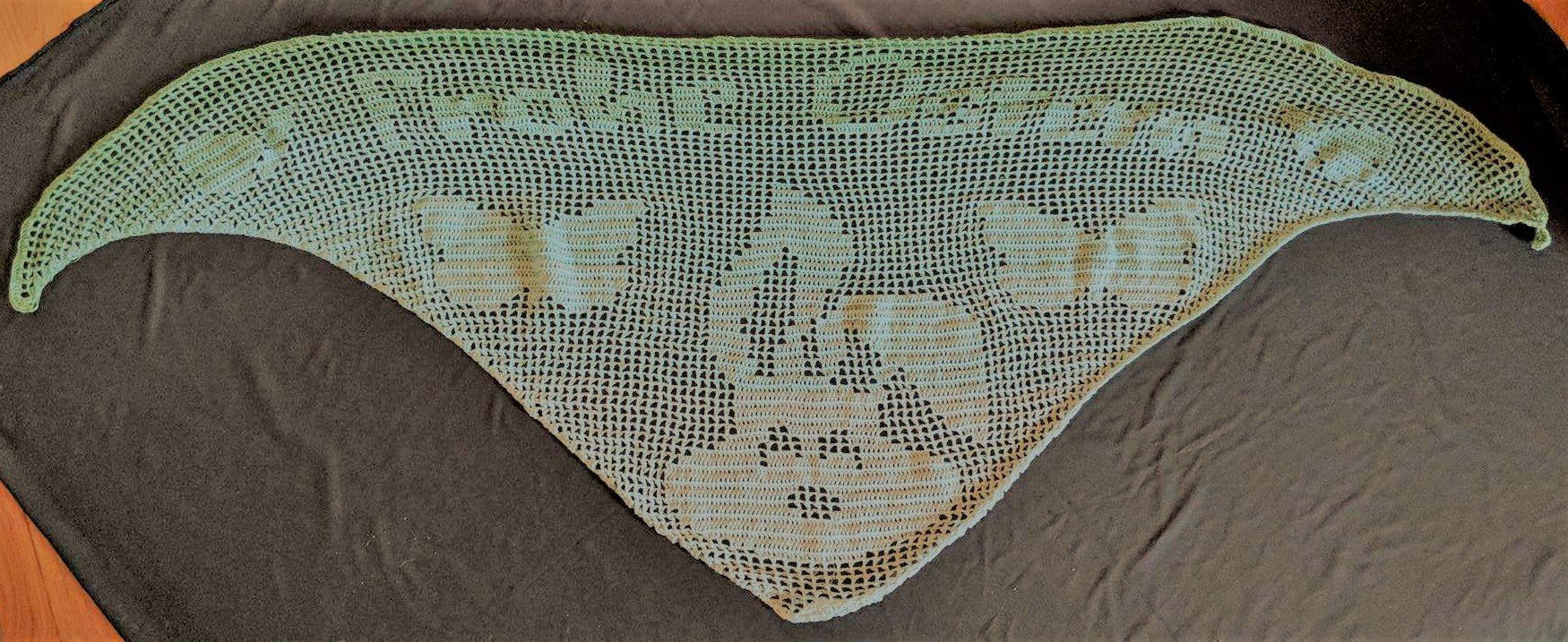 Das Motivtuch "Osterhase Paul" wurde mit ca. 850 Metern LL sowie 3 fädrigem Farbverlaufsgarn und einer 3er Nadel gehäkelt Es hat die Maße: ca. 195 cm x 90 cm
