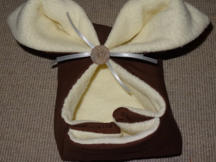 Ihr braucht nur je einen Rest Baumwollstoff, Fleece oder Plüsch und dünnes 0,5 cm Volumenvlies mit je 30 x 30 cm , 1 Knopf und 30 cm Geschenk- oder Satinband