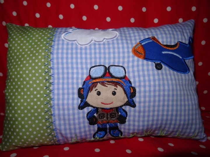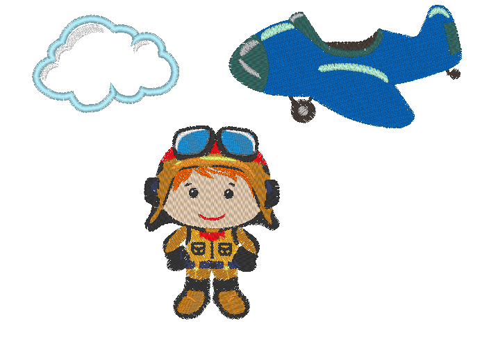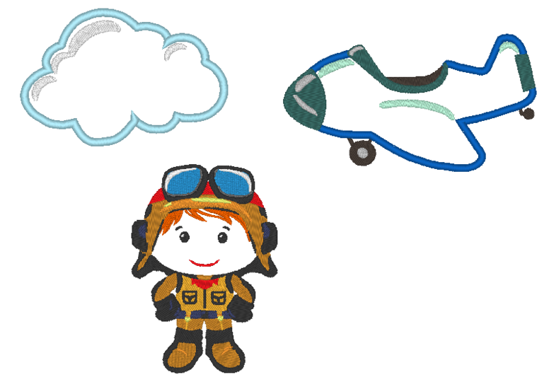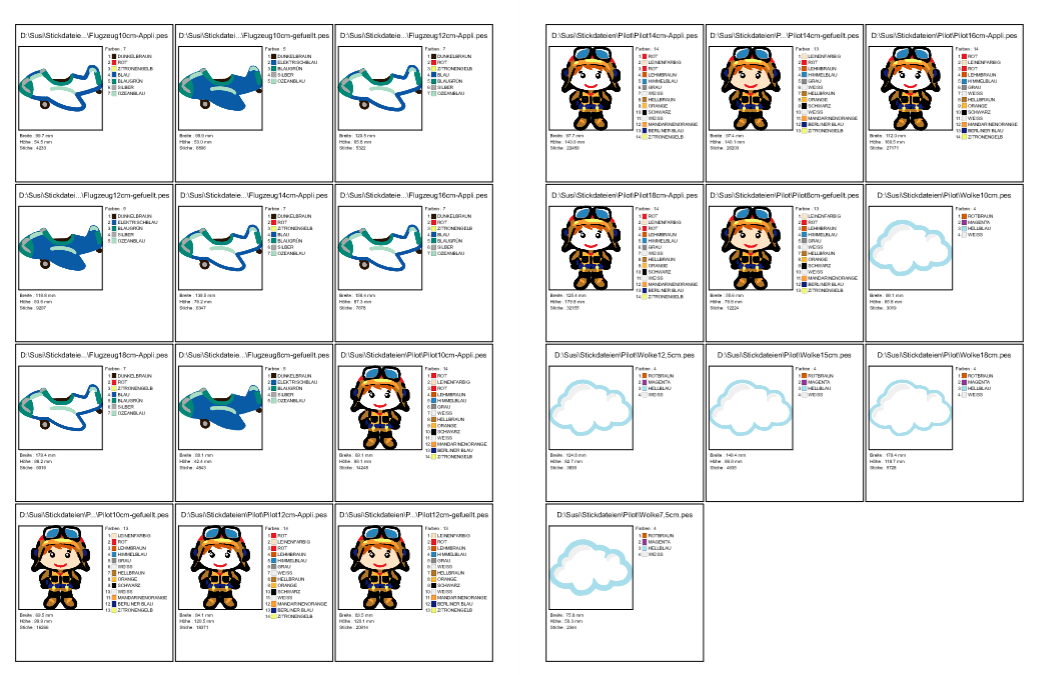Stickdateiserie mit Pilot, Flugzeug und Wolke in verschiedenen Größen