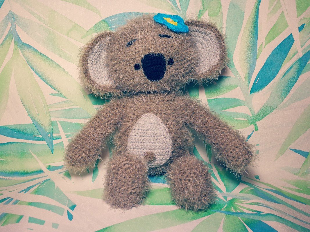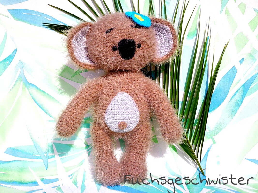 Das Koala wurde mit lana grossa estivo in der Farbe beige gehäkelt (3x50g) für den Körper, die Farbe silber von myboshi Lieblingsfarben No. 2 für die Ohren und Bauch (1x50g), für die Nase die Farbe schwarz von myboshi (Reste). Die Blüte ebenfalls aus myboshi Lieblingsfarben No. 2 in den Farben gelb und blau. Du kannst aber beliebiges Garn aus deinen Wollvorräten nutzen, welches farbig passt, jedoch musst du bedenken, dass sich die Größe der fertigen Figur dadurch ändert. Mein Koala ist ca. 35 cm hoch