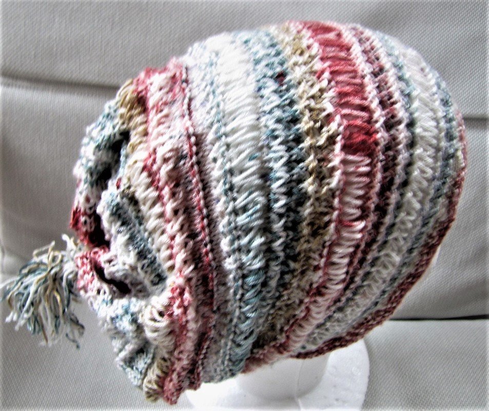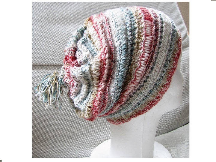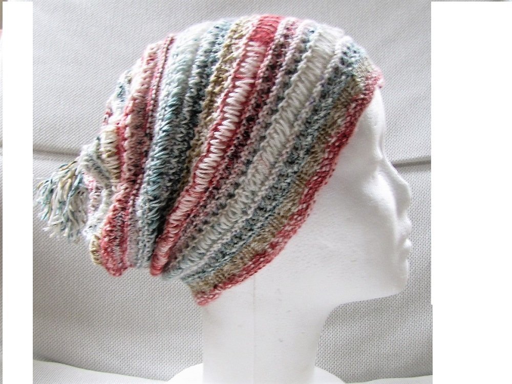 Die Mütze wird in verschiedenen Lochmustern und mit Fallmaschen gestrickt.