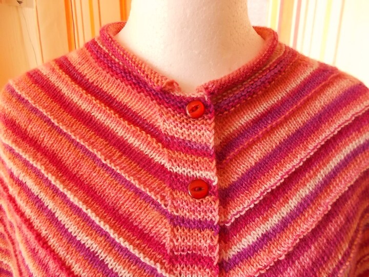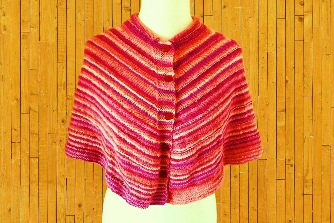 Es kann sowohl zugeknöpft als auch offen getragen werden und hält Schultern und Oberkörper schön warm, ohne einzuengen. Es ist bequem, super leicht und schnell an- und ausgezogen. Da es nicht allzu lang ist, hat man gute Armfreiheit. Ideal für die Übergangszeit und kühle Abende im Sommer, aber auch im Winter lässt sich das Poncho-Cape sehr gut über einem Pulli tragen.