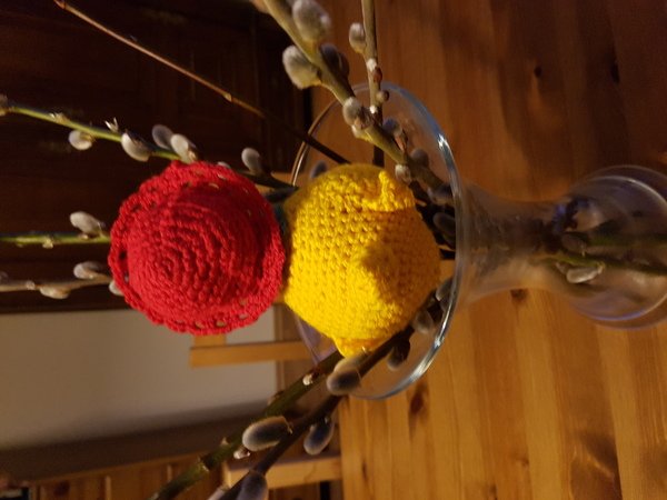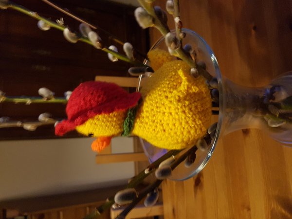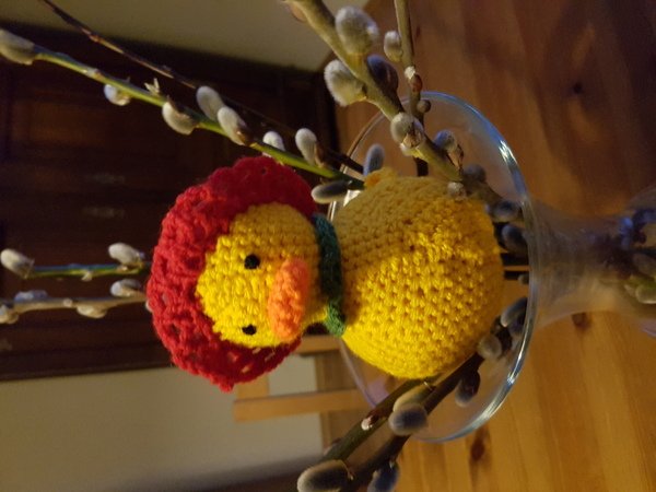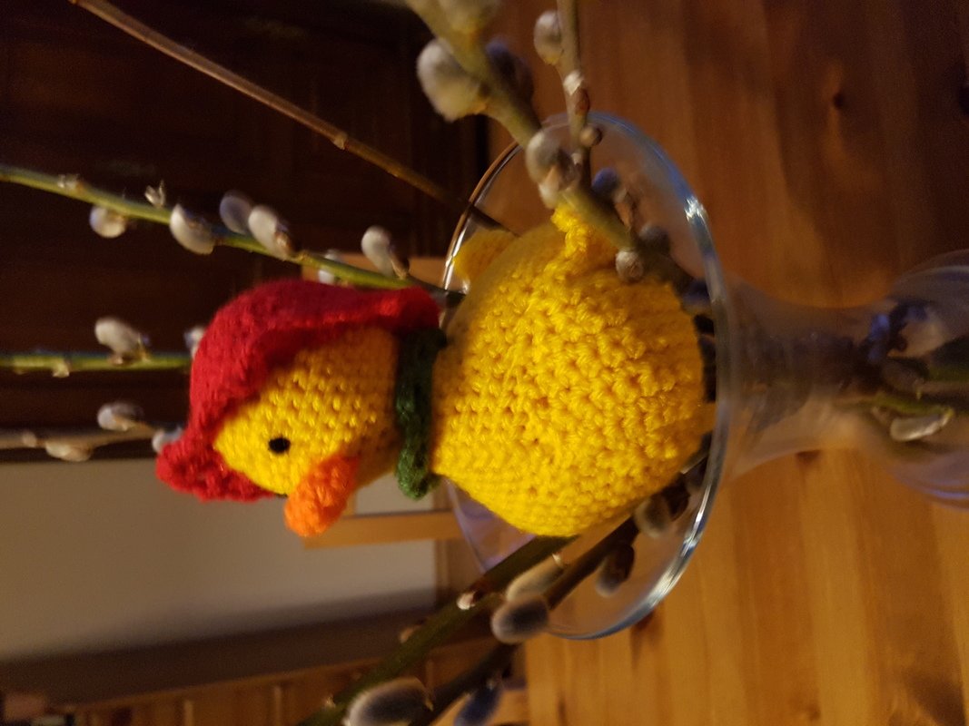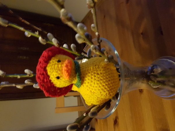 Ente Susi aus Wollresten in gelb, grün, rot und orange gehäkelt