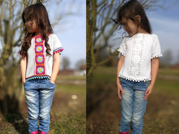 Das Shirt ist gestrickt und gemixt mit vielen Häkelein, das gibt dem Shirt das besondere Etwas.