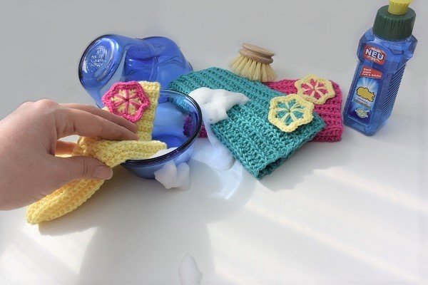 Baumwolle hat eine hohe Saugkraft und kann bis zu 8o% seines Eigengewichts an Feuchtigkeit aufnehmen. Durch mein Stricktur-Muster eignen sich diese Lappen besonders gut für alle Vertiefungen, wie Fugen und andere Unebenheiten.