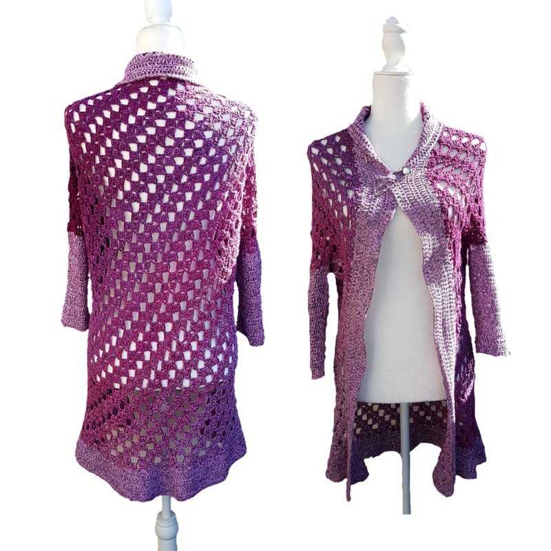 Die Jacke wird in einem Stück von Ecke zu Ecke wie das c2c Muster (in abgewandeltem Muster) gehäkelt. Durch das kann sie in jeder Grösse gemacht werden.