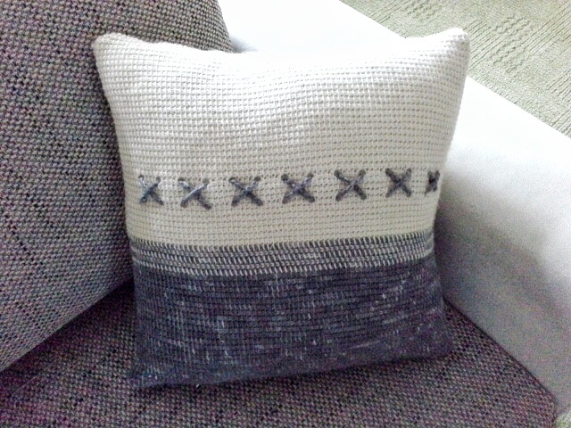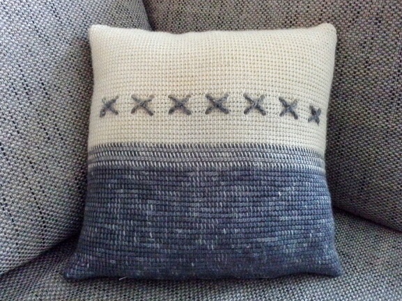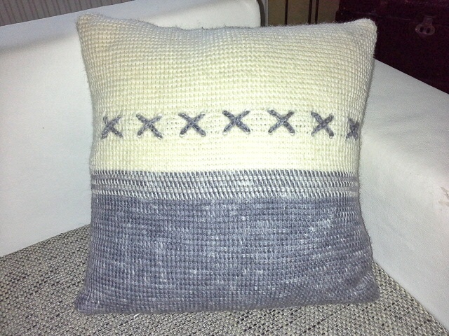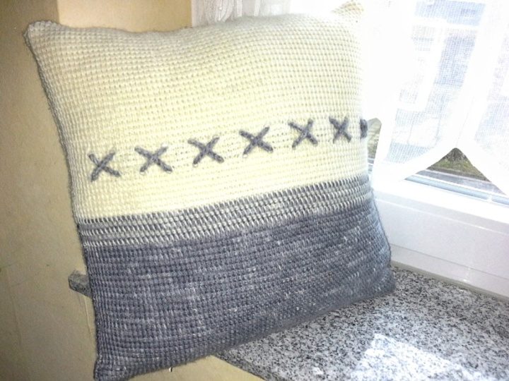 Ein Kissenbezug in tunesischer Häkeltechnik gearbeitet, mit einer verkreuzten Häkelkordel als Schmuck. Ansonsten ist der Bezug schlicht gehalten, soll er sich doch Eurem Sofa oder Sessel gut anfügen. Häkelt das Kissen gerne in den Farben, die zu Eurer Einrichtung passen, grau-weiß ist nur ein Beispiel.